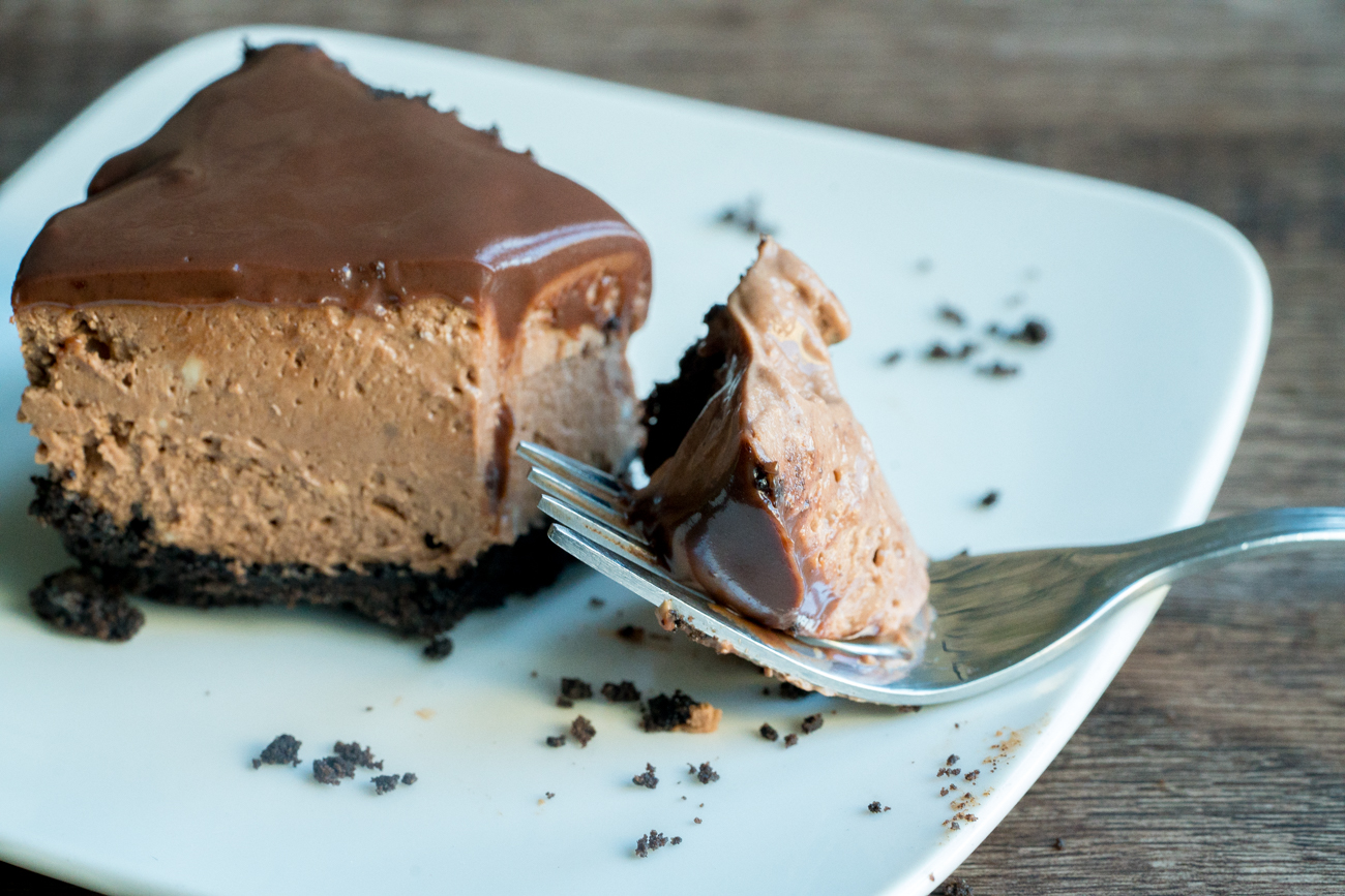 11. Combine chocolate chips and whipping cream in a microwave safe bowl. Microwave in 30 second intervals until melted, stirring in between. Let cool slightly to thicken and pour over cheesecake. Slice and serve. Enjoy!