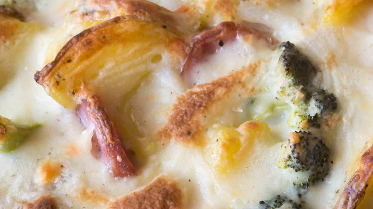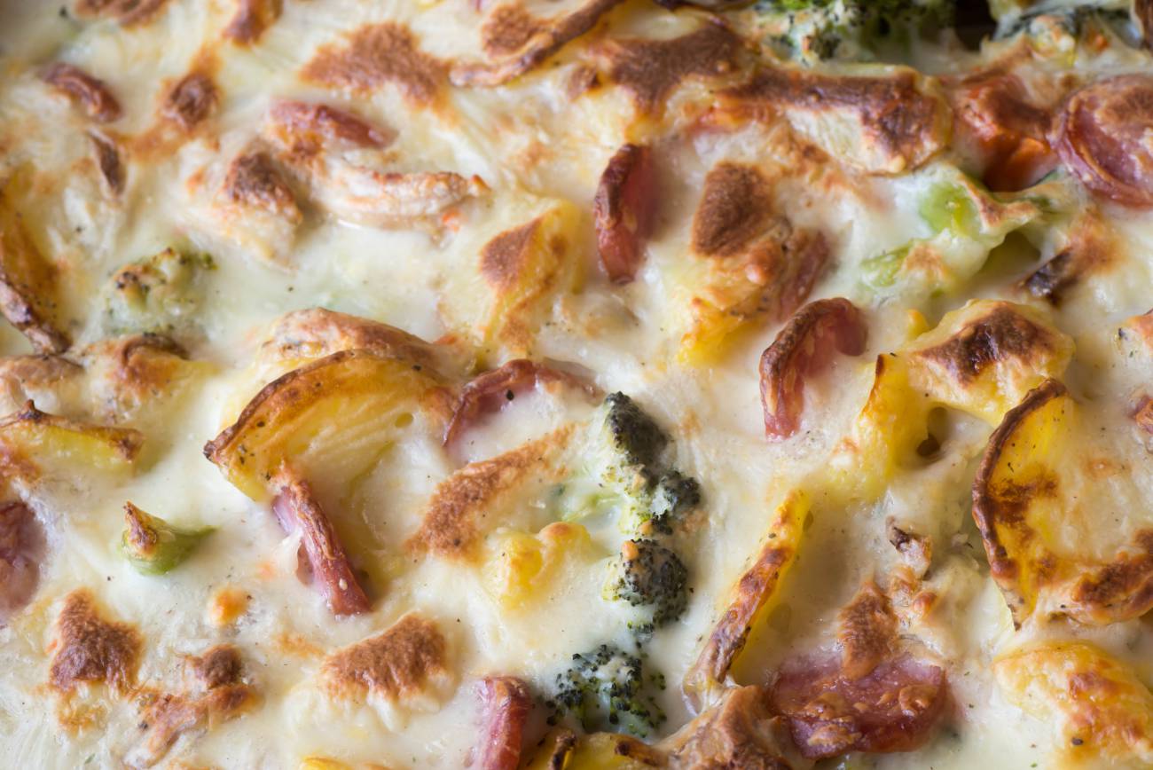 - Scatter bacon pieces, broccoli florets, chopped onion, and potatoes evenly into casserole dish.