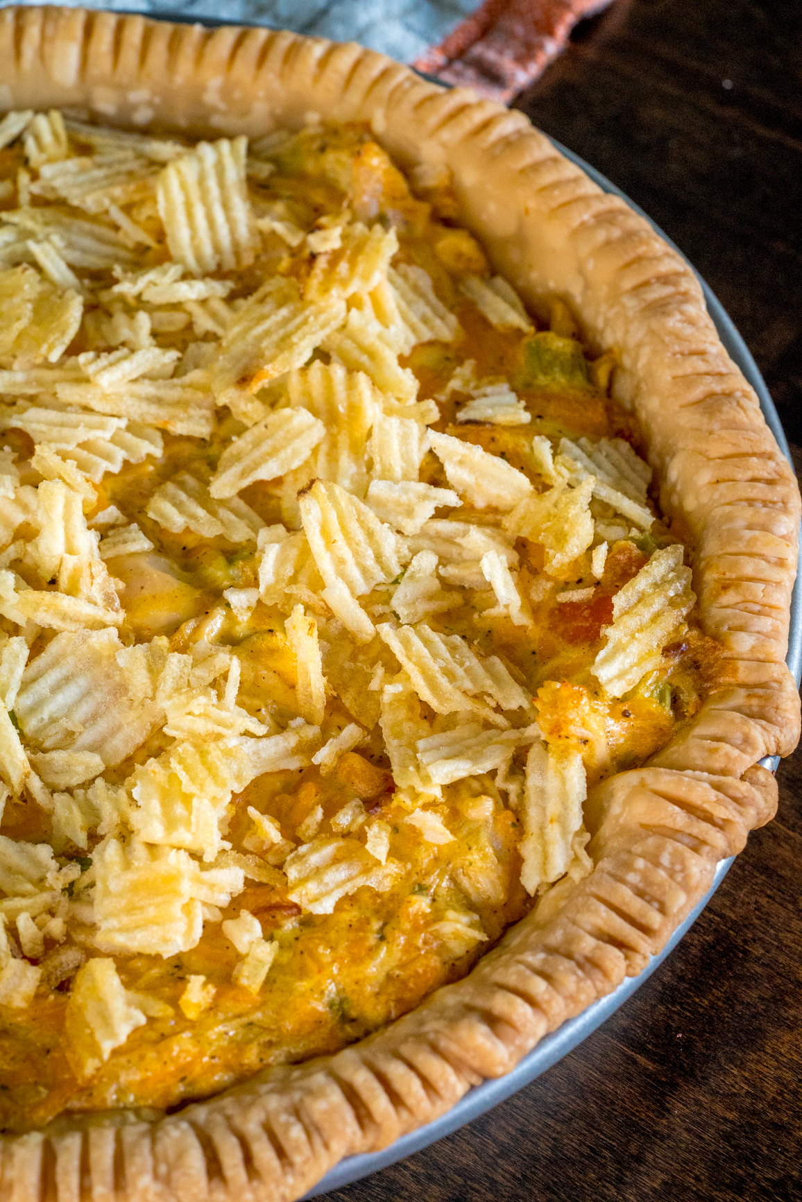 Raise your hand if you’re a die-hard chicken salad lover. (Just us?) There’s something about this picnic classic that we absolutely love, so you know that if there’s chicken salad at a potluck or backyard BBQ we’ll be making a beeline for it. That being said, we thought it was high time we update this dish a bit. Instead of a traditional chicken salad – although still with a lot of the same ingredients as one – we added a pie crust to the mix and threw the whole thing in the oven to bake up to piping hot perfection. Not only that, but it’s perfection topped off with ridged potato chips. Yum.