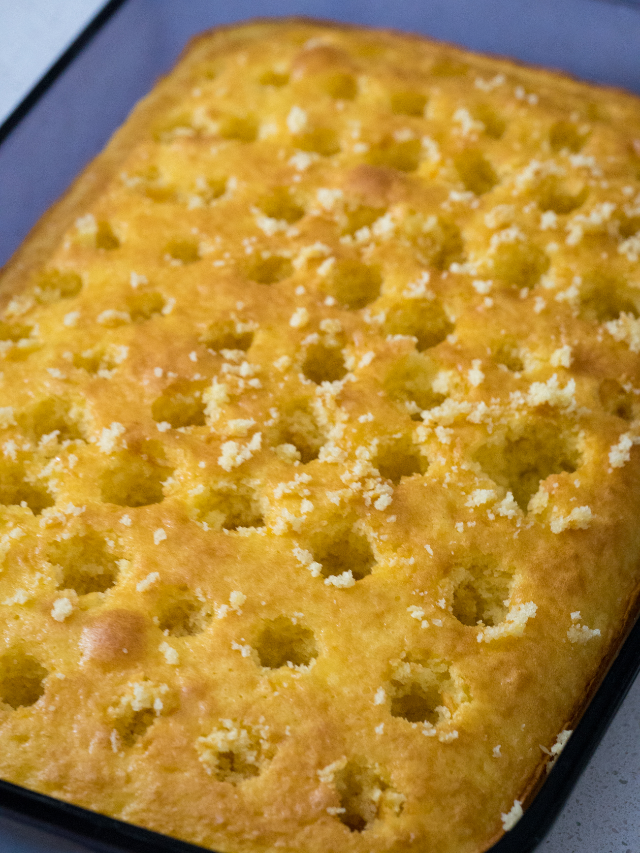 - Once the cake has cooled slightly, poke holes all over the cake using the end of a wooden spoon.