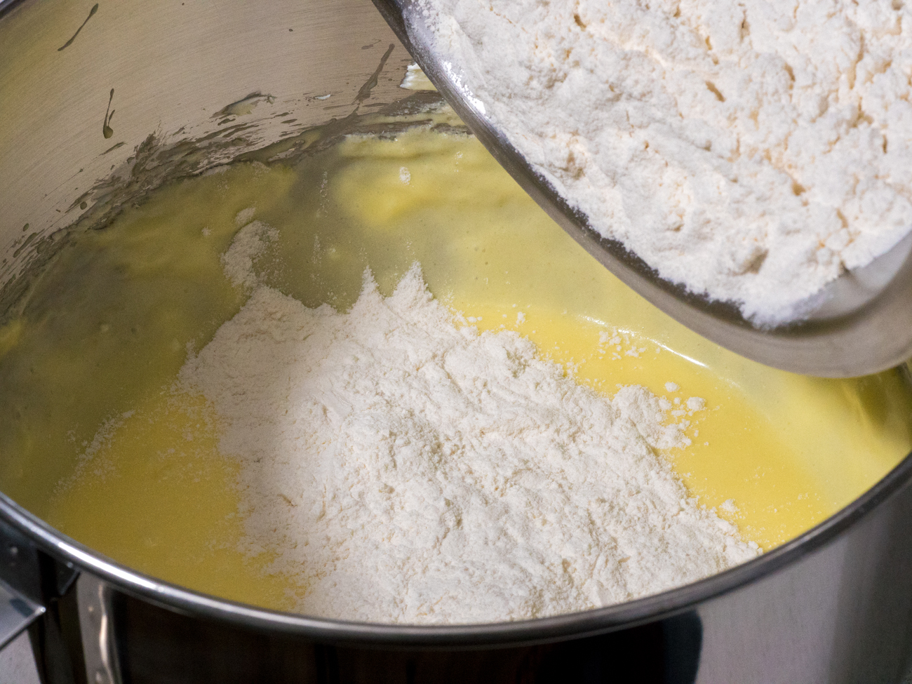 - In a separate bowl, stir together the remaining 2 cups flour, baking powder, and salt. Gradually mix into the wet ingredients until thoroughly incorporated.