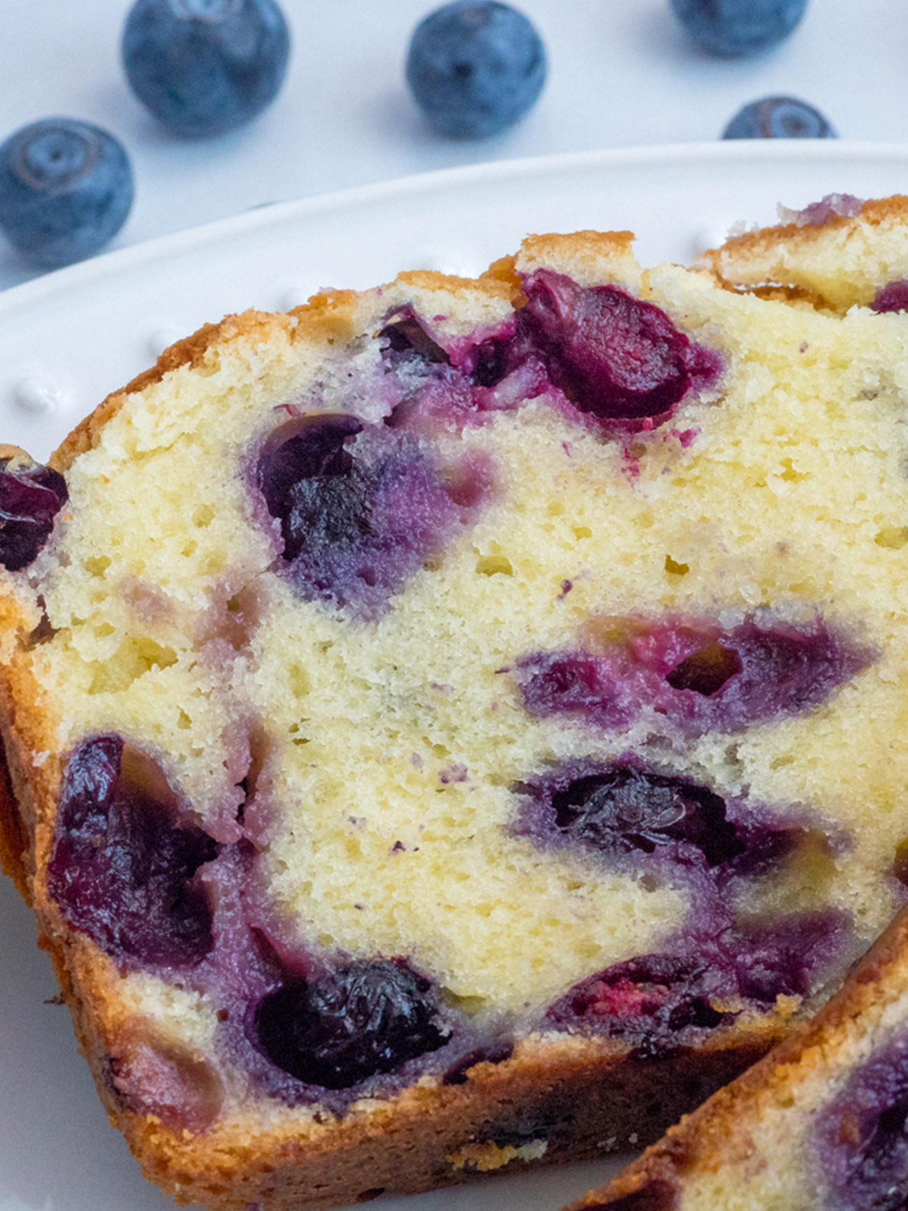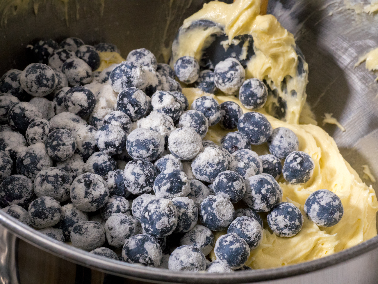 You can use either fresh or frozen blueberries here, but either way, it helps to dust them in a bit of flour before folding them in. It keeps them from all sinking to the bottom. And if you’re having a blueberry loaf, you want a blueberry in every bite!