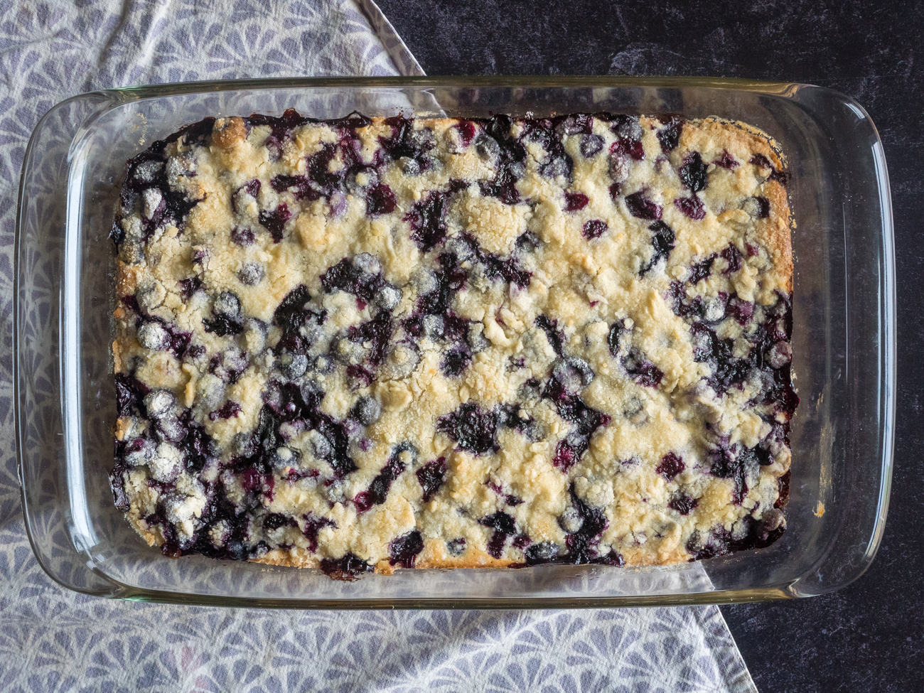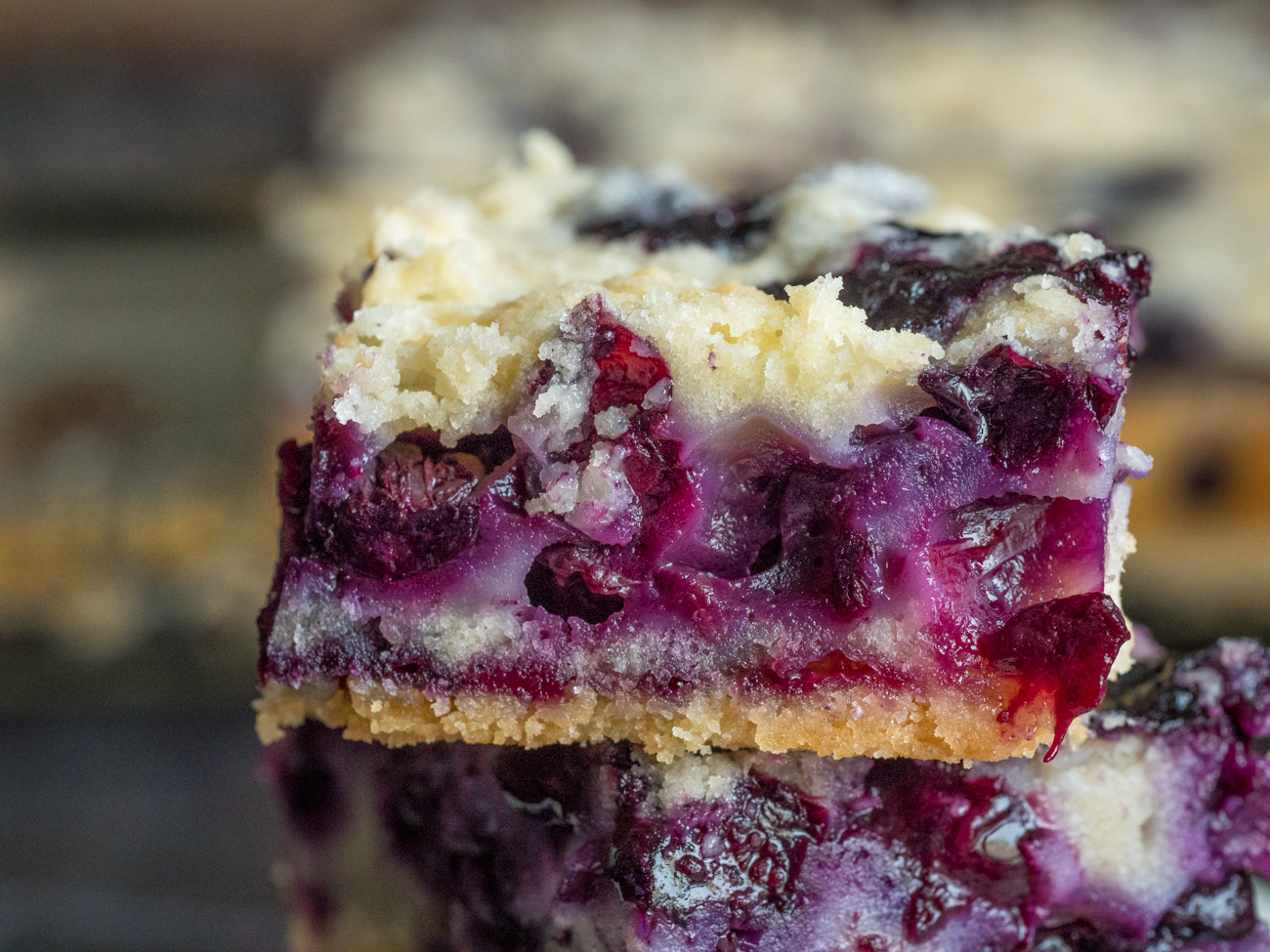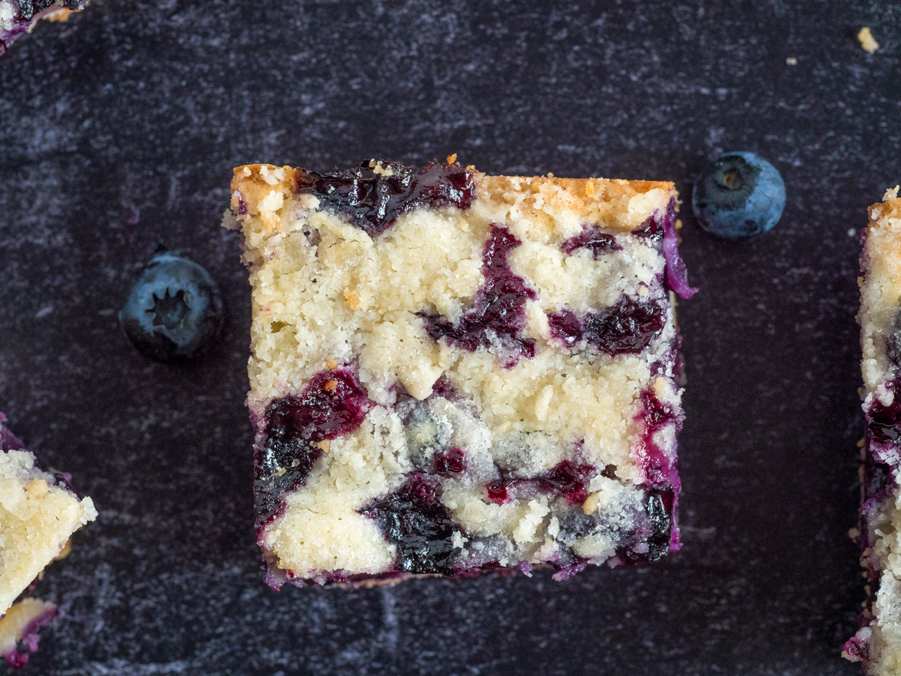 The bars must cool before you slice a square to share. Patience, as they say, is a virtue and watching these bars cool really tests my patience! My favorite part of blueberry pie bars is, of course eating them, but it’s that first piece that I cut from the dish. Just look at that beautiful blueberry marbling! It’s a visual masterpiece, a captivating aroma, and a sensation for the sweet tooth all in one.