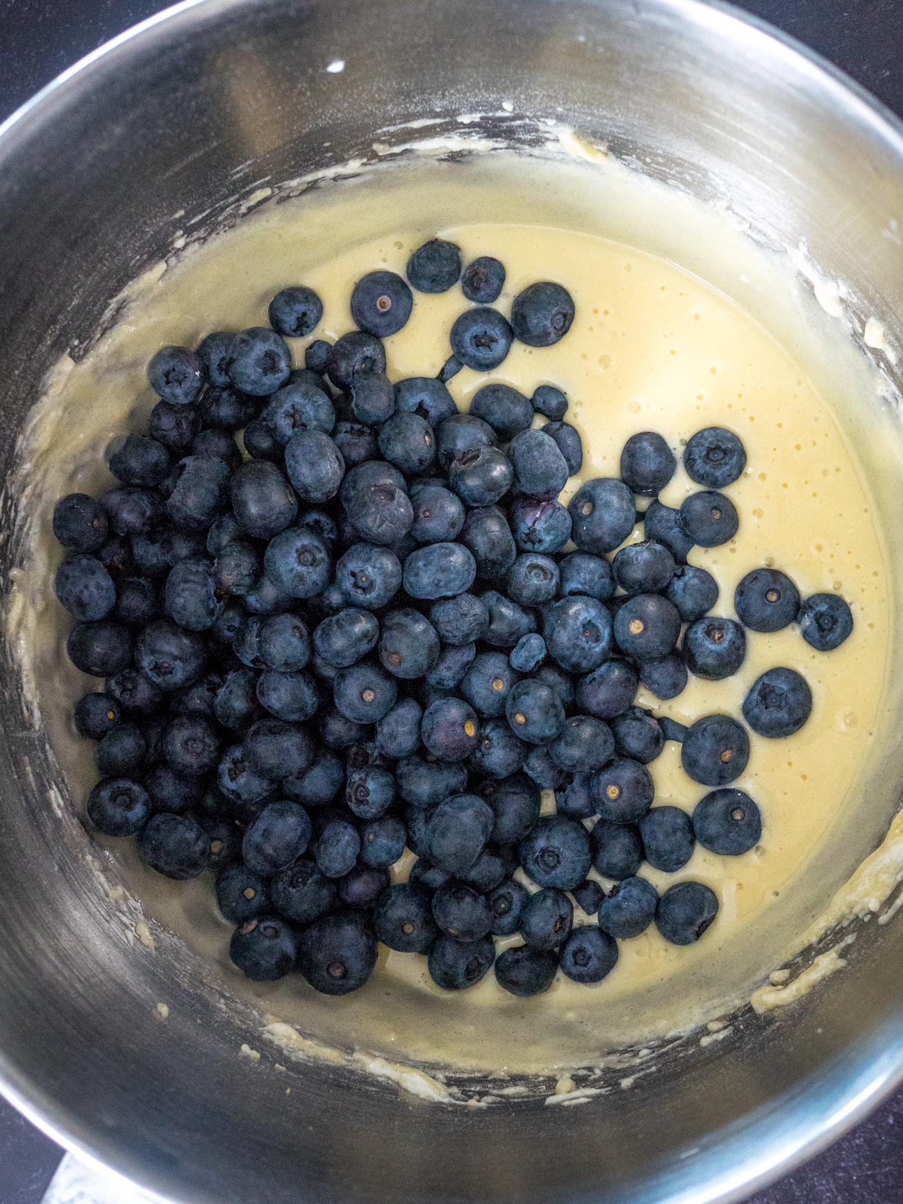 - Add sugar, sour cream, flour, and salt, and mix until thoroughly combined. Gently stir in blueberries.
