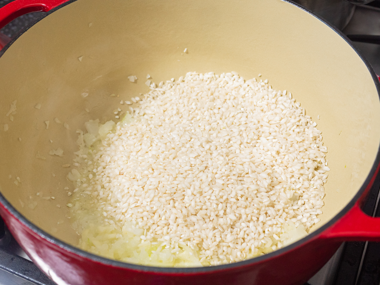 It starts the way many risottos start, by sauteeing some onion in butter before the grains of rice join them until they start to turn translucent. But that’s where the traditional preparation ends. After the stock is poured in, the Dutch oven heads into a hot oven on one rack, while broccoli goes on another on a baking tray.