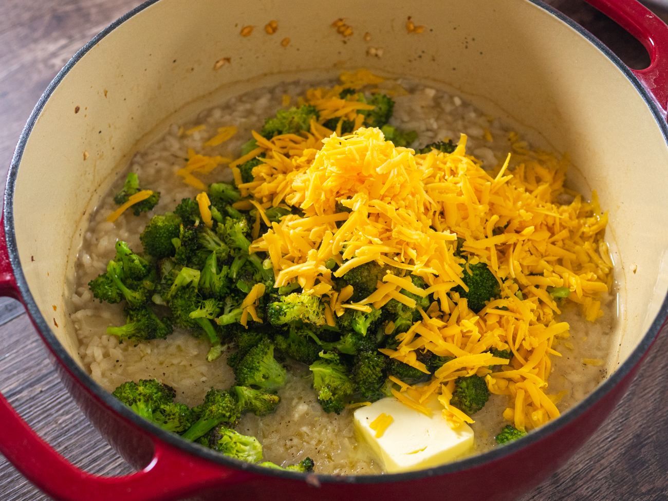 After most of the liquid is absorbed into the rice, the broccoli gets stirred into the pot along with some cheddar and a bit of butter.