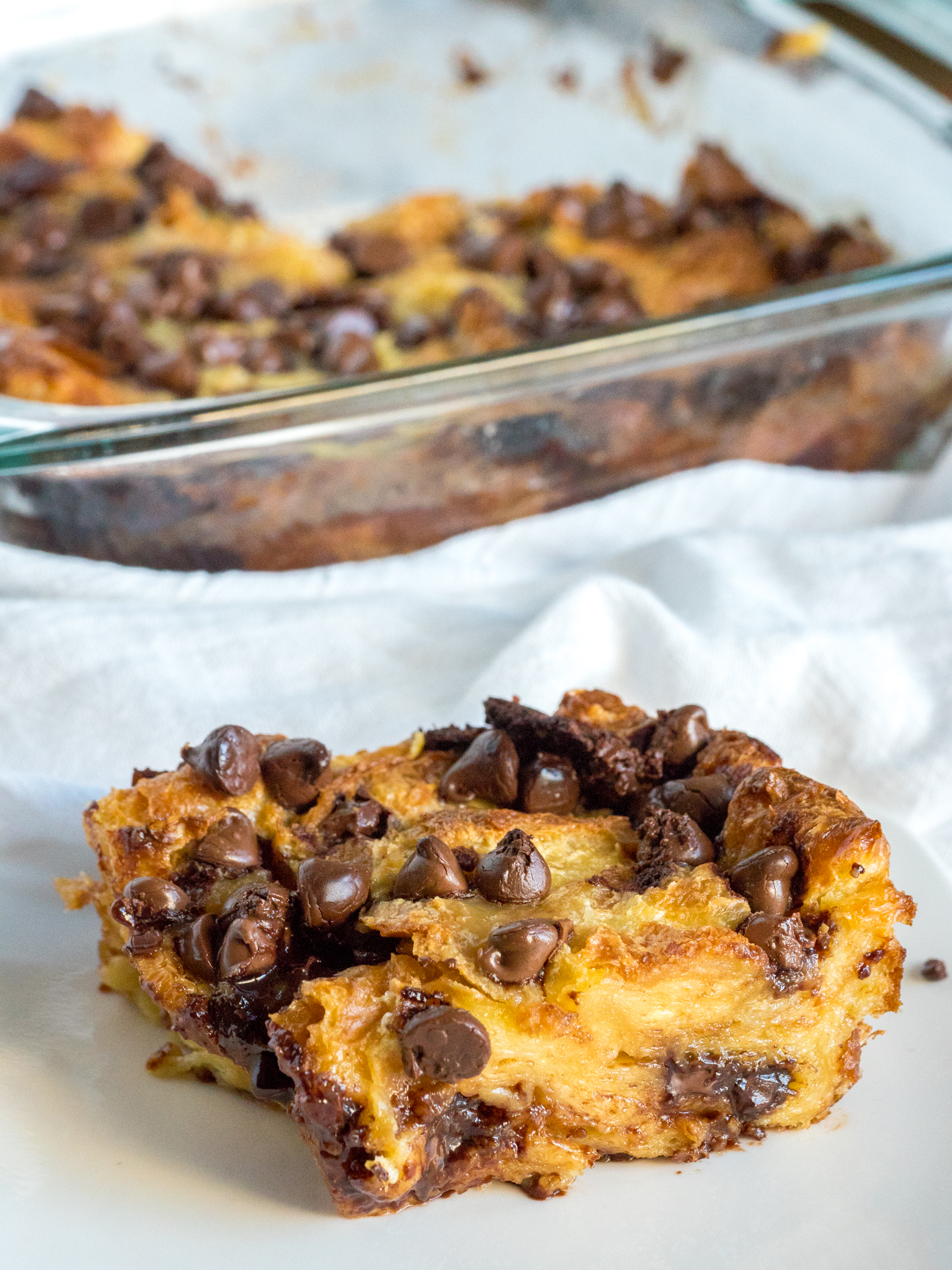 The chocolate doesn’t end there. After everything has been tucked into a baking dish, a few more chocolate chips get sprinkled on top for good measure so that every bite is sure to have a pocket of velvety melted chocolate. As it bakes, the croissants absorb the flavor of the sweet custard while maintaining some golden brown flakiness around the edges so there’s a nice contrast in texture as well as a whole lot of delicious flavor (without a whole lot of work).