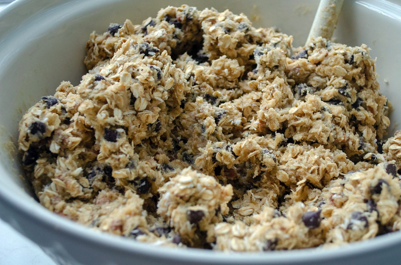 - Add flour mixture and beat on low until just combined. Stir in chocolate chips, oats, coconut, and pecans.