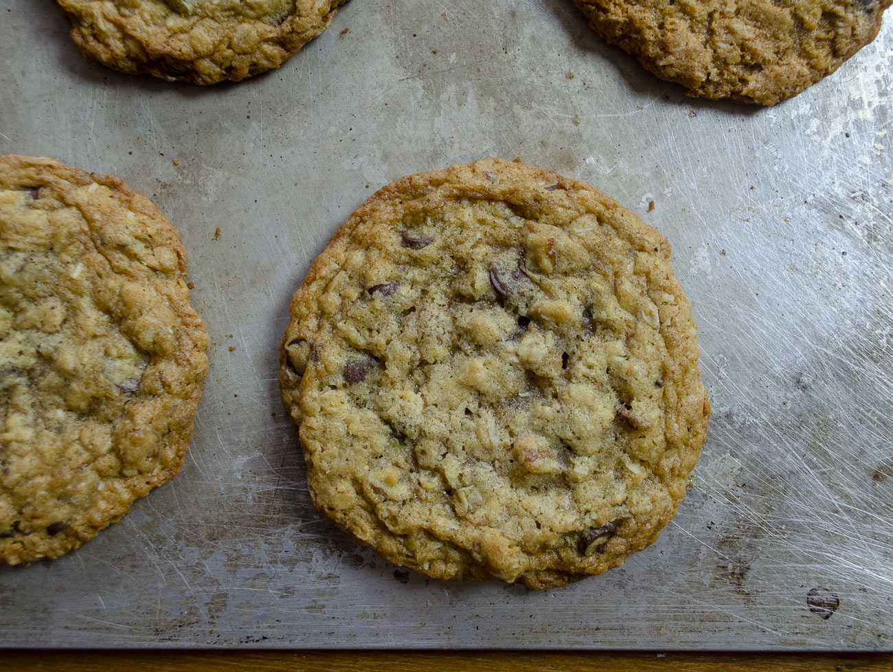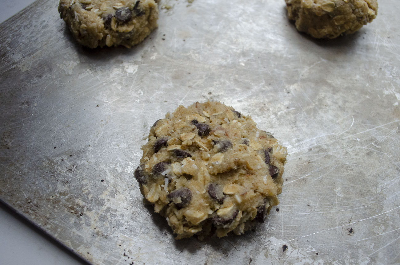 The recipe starts as a basic chocolate chip cookie recipe but then folds in shredded coconut, rolled oats, chopped pecans, and cinnamon. That’s ten cups of additions stirred into the dough, so you’ll need your biggest bowl… and some sizable arm muscles. It’s a thick dough, but the end result is a cookie with a chew and texture that’s just positively unmatched.