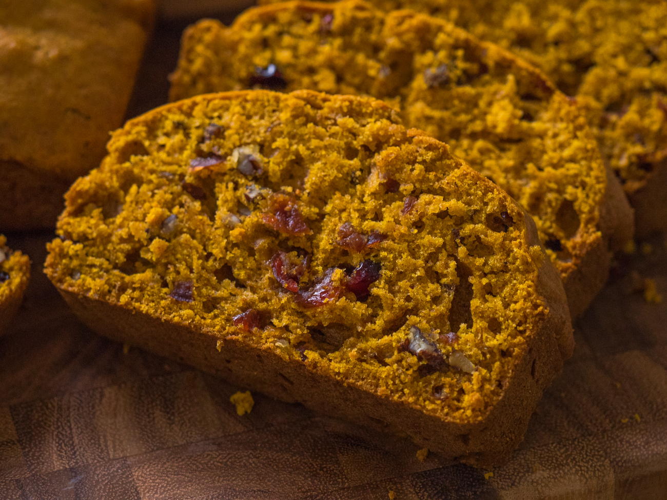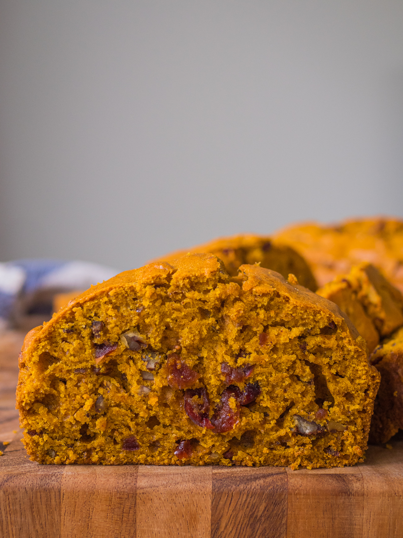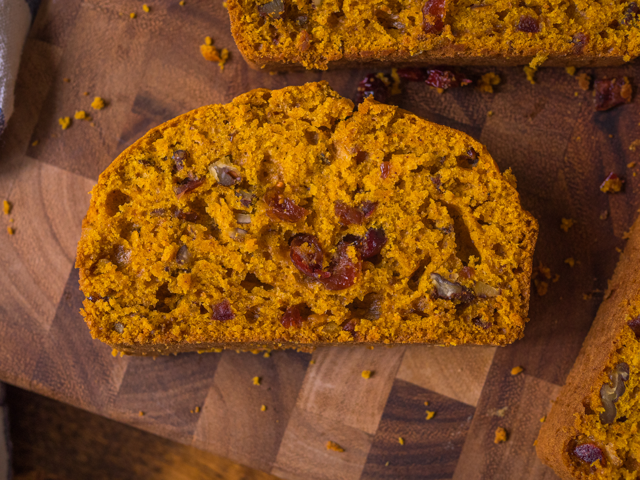 When I get an urge to make a quick bread, I often turn to banana bread, but this Pumpkin Bread is one I should be making far more often. It’s just as quick as any banana bread and just as delicious too, but with a totally different autumnal flavor profile. It’s moist and pumpkiny but studded with chewy cranberries and crunchy pecans so every bite comes with pumpkin spice, but also a tart burst of flavor. It’s good, friends, real good. Good enough to give away, but good enough that you don’t feel at all guilty keeping it all to yourself. (Luckily this recipe makes two loaves, so you have plenty to go around!)