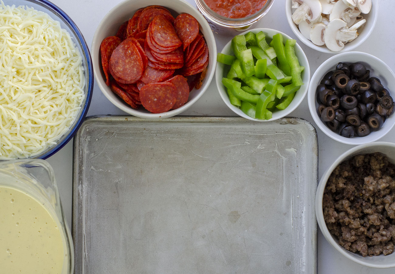 - Pour batter into prepared pan and tilt pan around until bottom is evenly coated. Sprinkle the cooked meat, pepperoni, and mushrooms over the batter. (Save some toppings for top if desired.) Bake for 20 minutes.