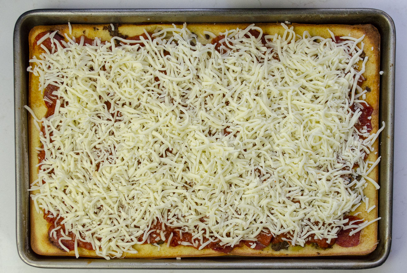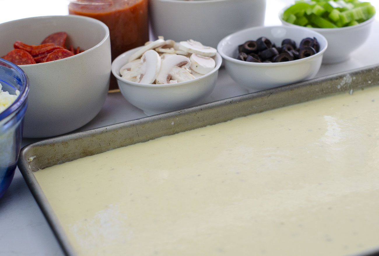 You pop that into the oven for twenty minutes, and the batter rises up to surround the toppings, which creates a sturdy base for the rest of the pizza classics.