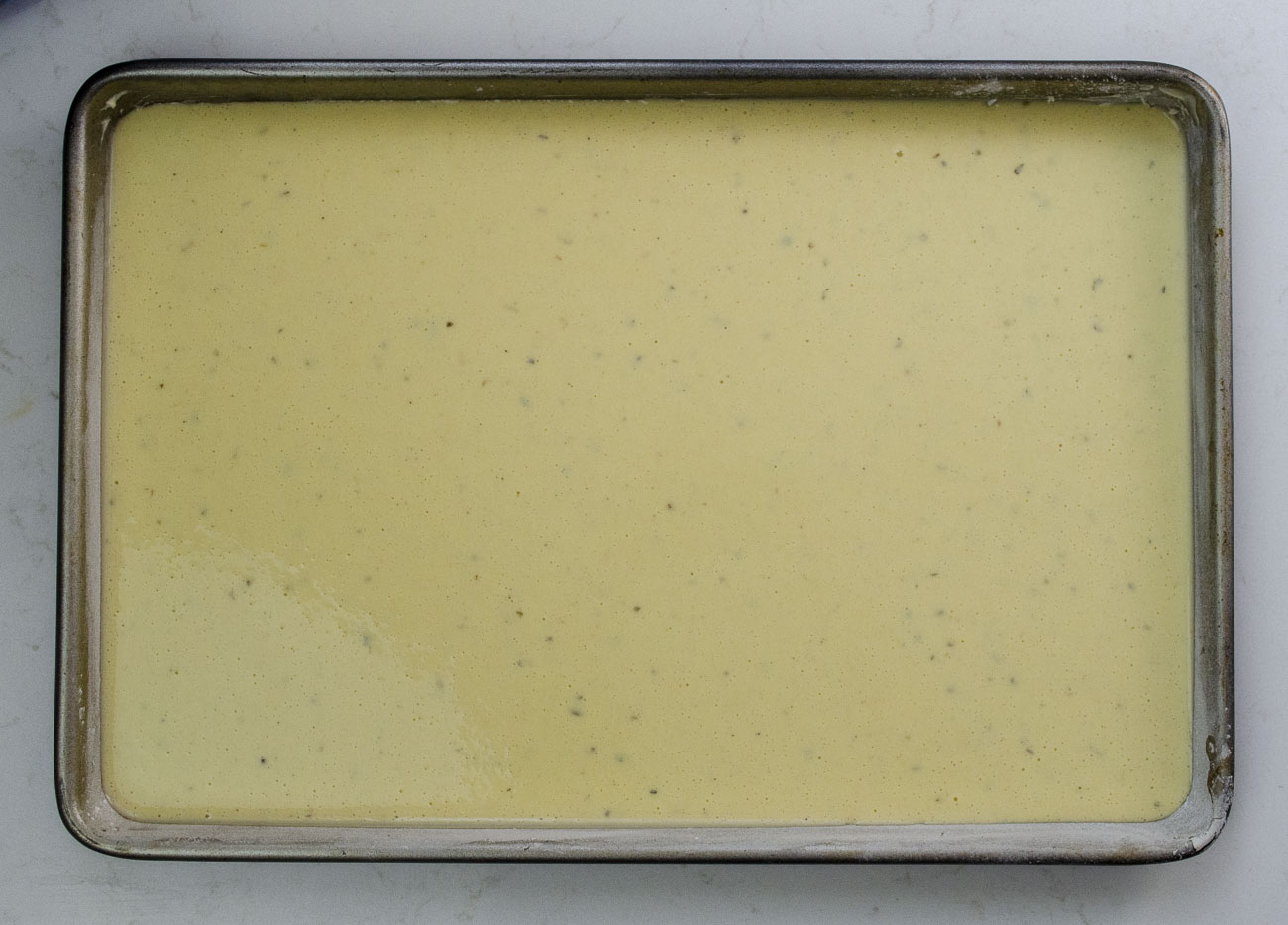 Then you mix up a liquid batter of flour, eggs, milk, and a few seasonings and pour it into the pan.