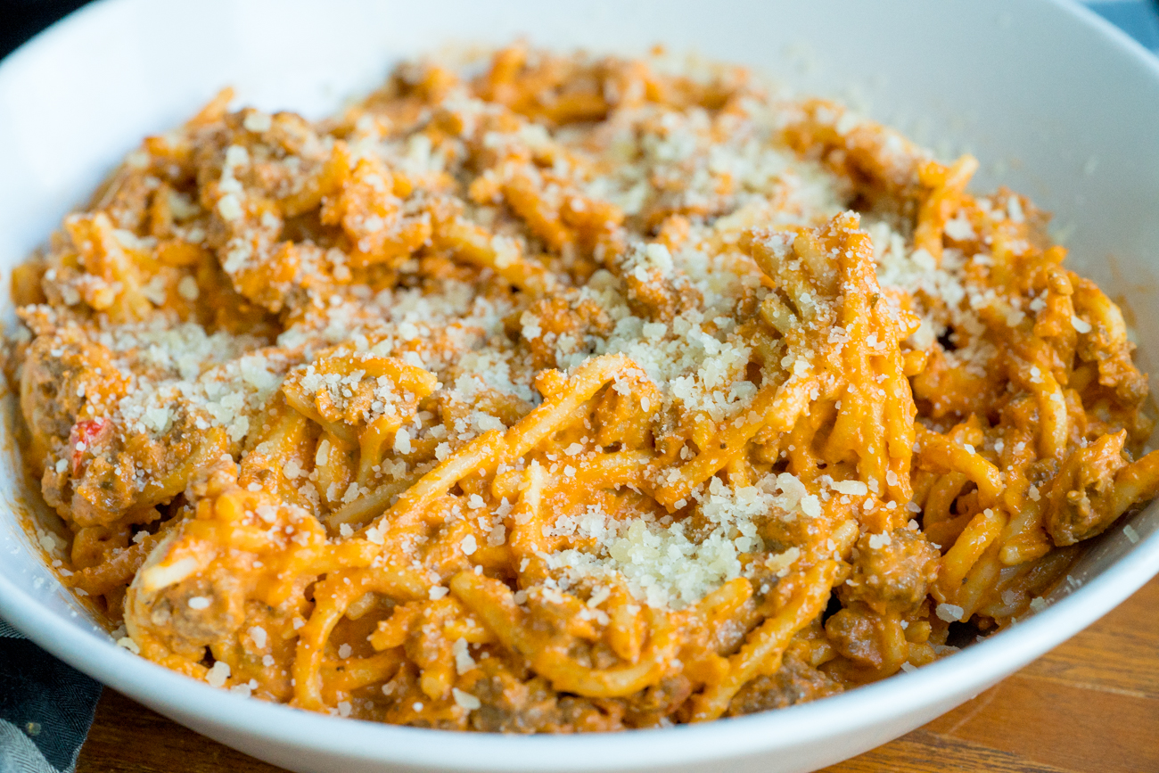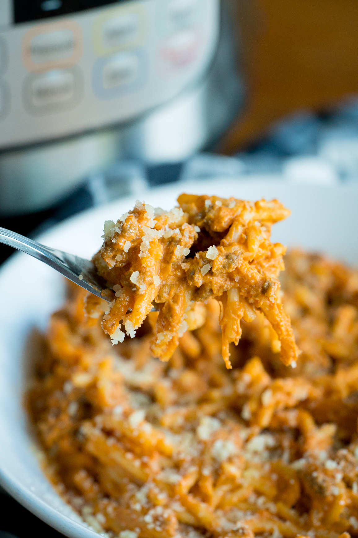 It only takes a nine-minute cook time for the noodles to get nice and tender and once the pressure is released you stir in the cream cheese and a bit of Parmesan which melt into the sauce and make it so nice and creamy. And that’s it – dinner’s served. If it got any easier it would cook itself, but thanks to the Instant Pot, I guess it kind of does!
