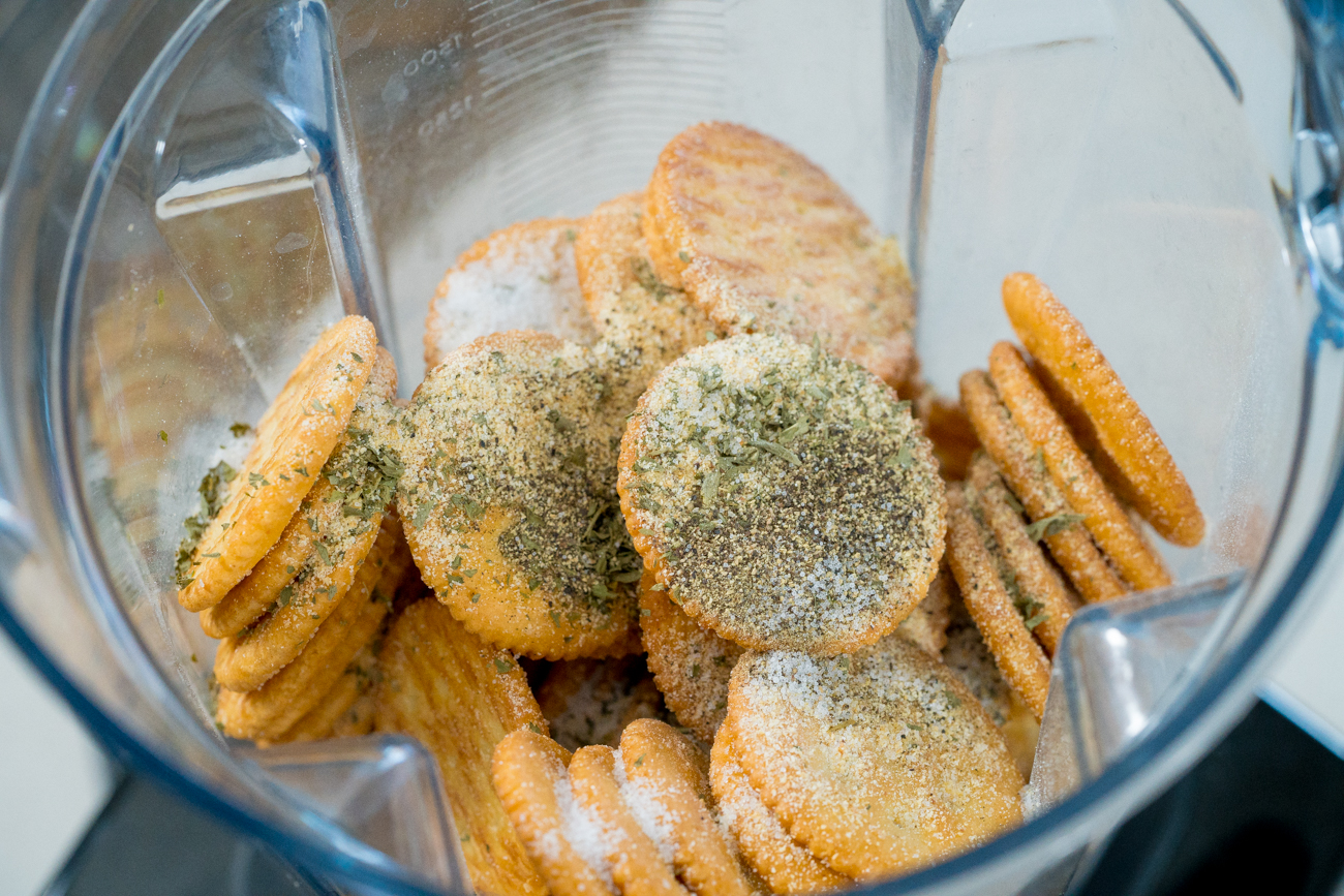If you’re not already familiar with the process, then you’ll love how easy it is to put together. The crackers are pulsed in a blender along with our seasonings and some melted butter until nice and crumbly, and then an egg mixture to act as a glue for our crumbles.