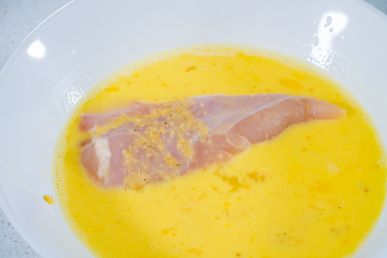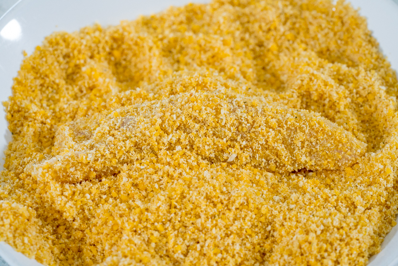 You’ll dredge the chicken into the egg mixture then into the dry crumbs, coating the chicken evenly. The chicken pieces go into a prepared baking dish and bake for about 30 minutes.