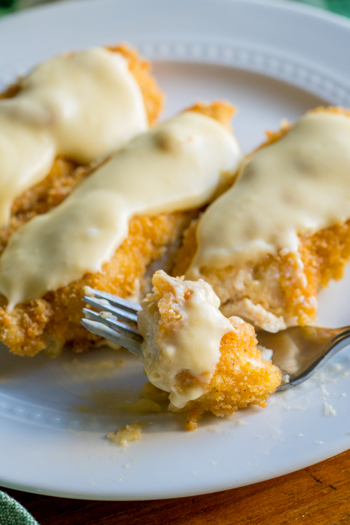 And that’s pretty much it! But, why stop there? A can of cream of mushroom soup will make a rich and creamy sauce to pour over top of these crispy chicken pieces and the meal is complete.