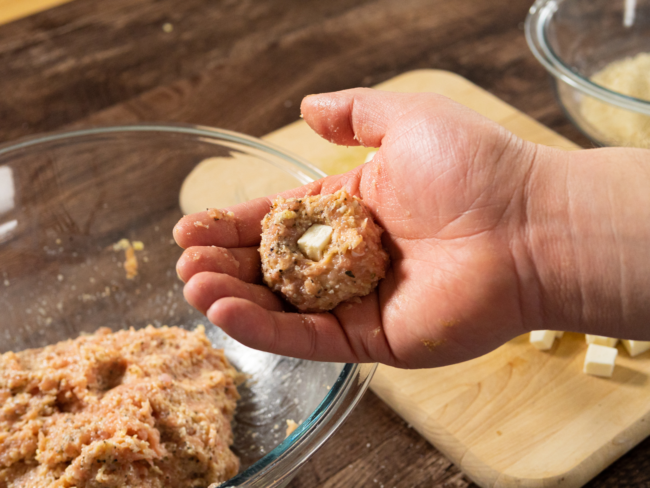 - Shape mixture into golf ball-sized balls and press a cube of mozzarella into the center of each one, sealing the meat around it.