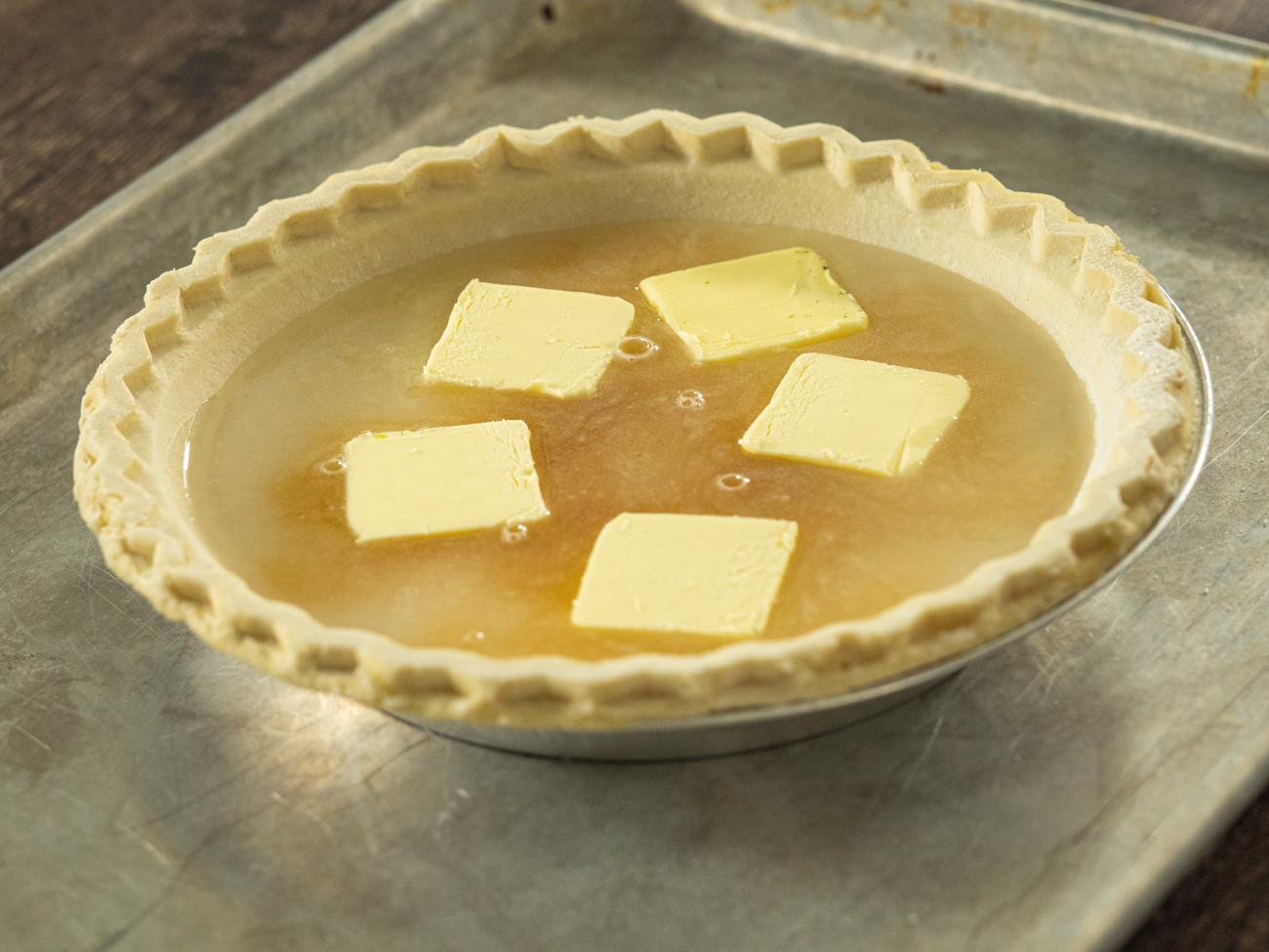 - Drizzle vanilla over the pie, then evenly place pats of butter over the top.