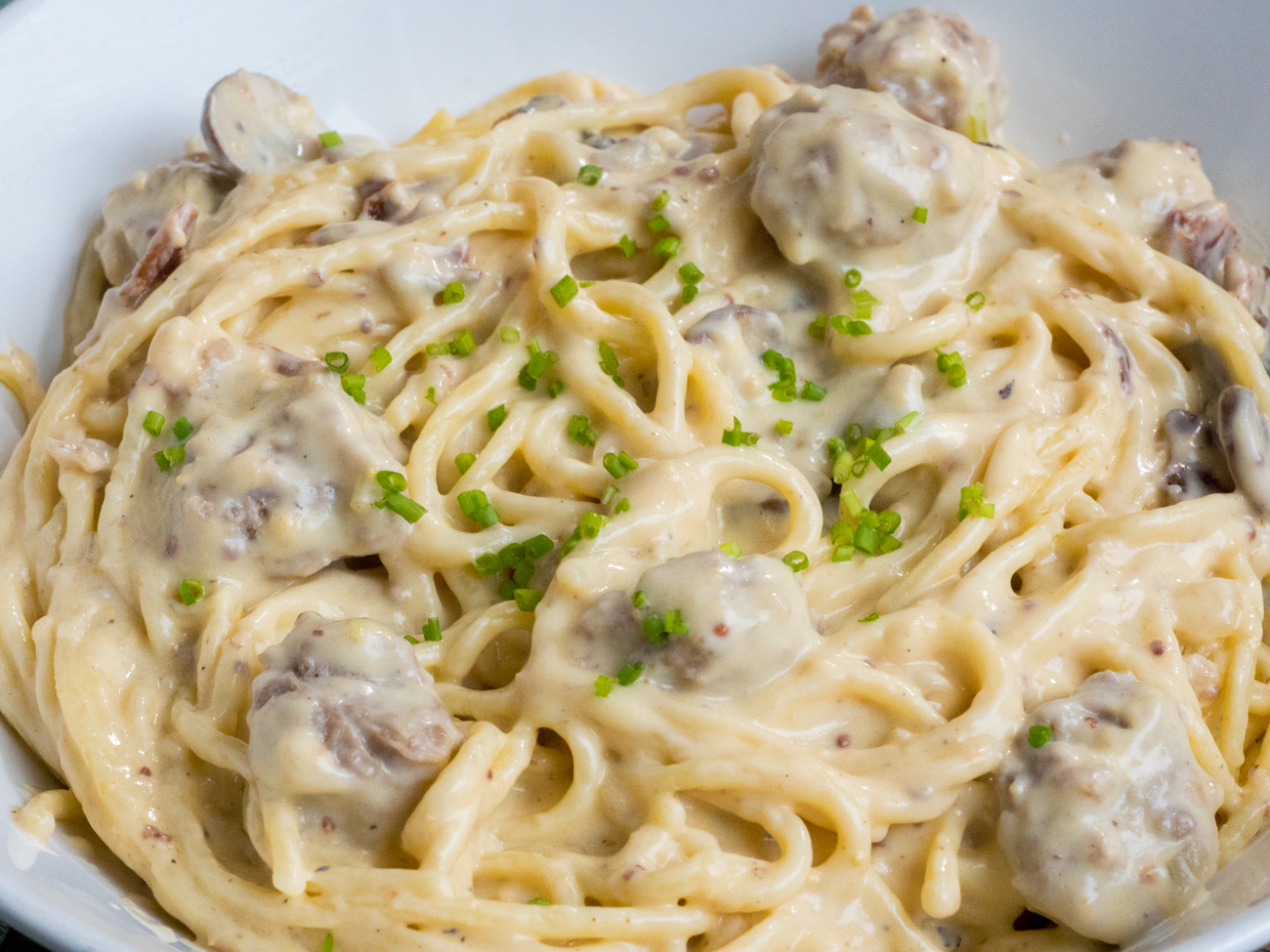 It’s the kind of pasta dish that’s quick but more than hearty enough to make up an entire meal and that’s thanks to the fact that it features both bacon and sliced bratwurst, as well as some earthy mushrooms.