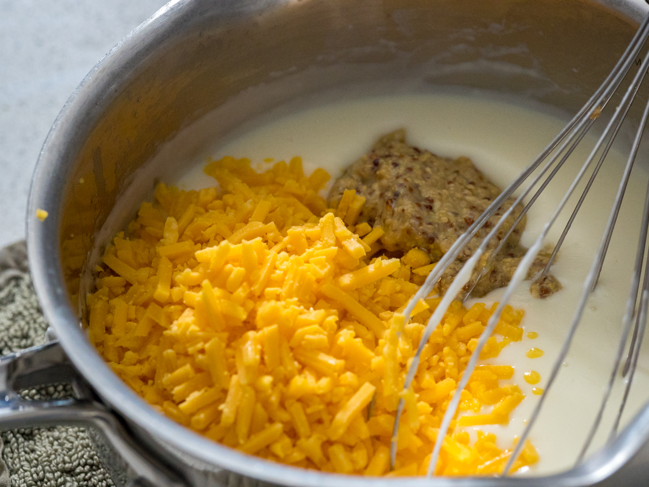 In another saucepan, you make a simple roux as a base for the creamy sauce, which is comprised of milk, stoneground mustard, and cheddar cheese.