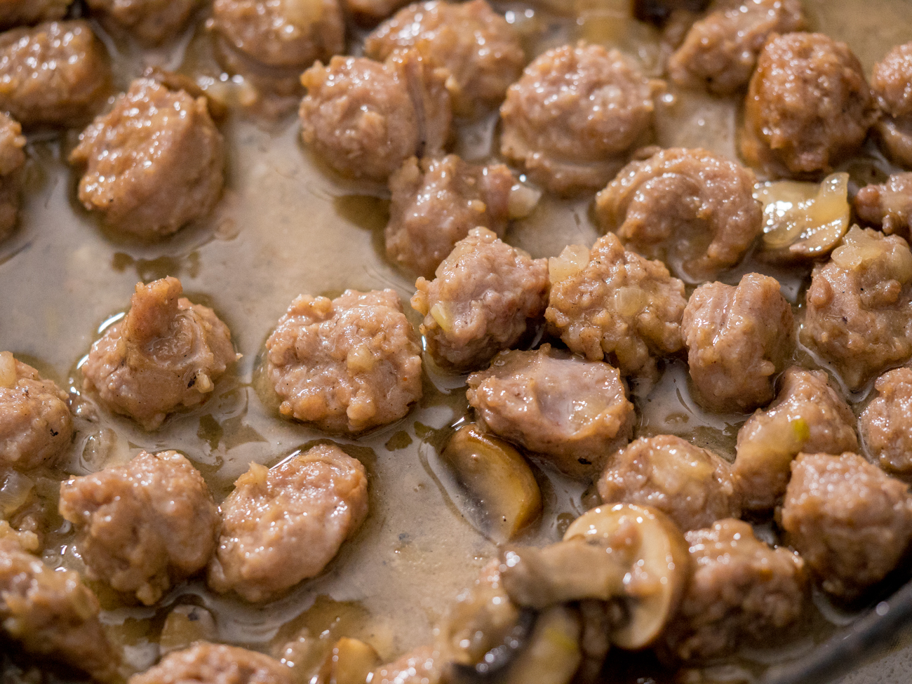 - Add sausage and onions and cook until sausage is starting to brown and onions are translucent. Add mushrooms and cook until soft and onions have started to caramelize.