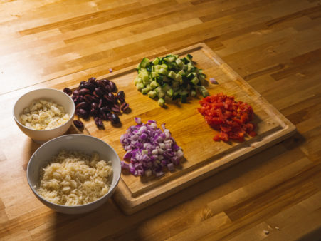 After that, it’s just a matter of chopping up your veggies, cooking your rice, and tossing everything together! You can prepare the rest of the meal while the chicken is marinating. Don’t forget to reserve half of the marinade to use for the dressing. You definitely don’t want to reuse the marinade the raw chicken was sitting in, for obvious reasons.