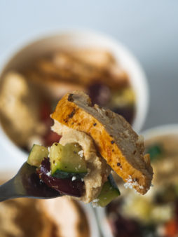 - Divide rice between 4 bowls. Slice the chicken breasts. Top rice with cucumber/tomato mixture and chicken. Sprinkle with feta cheese and serve with hummus. Enjoy!