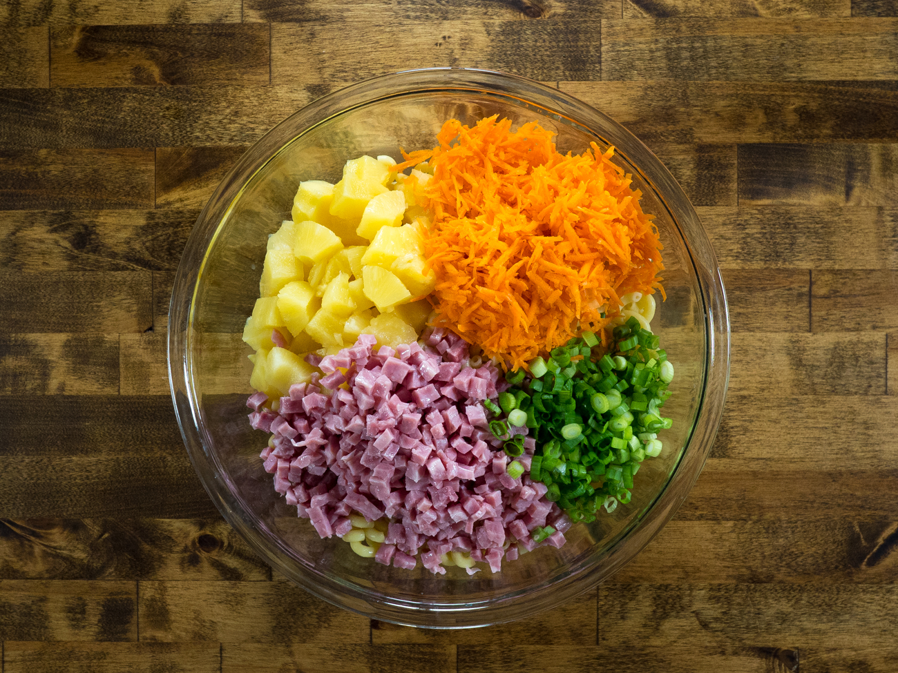 - In a large bowl, add macaroni, pineapple chunks, diced ham, carrots and green onion.