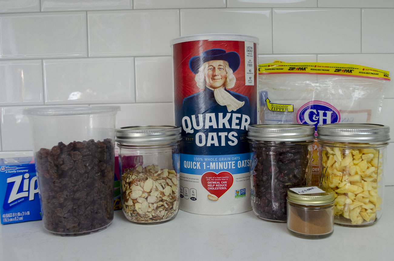 We like to go ahead and put our DIY packets together on a Sunday and make a few different topping options so that there’s something to suit everyone’s tastes for the week. It doesn’t take long at all and it’s easy to make a wide variety. For this round, we’ve gone with brown sugar and cinnamon, apple spice, apple cranberry, and fruit and nut. You can, of course, create whatever combinations sound good to you and your family. That’s the beauty of this — it’s totally customizable.