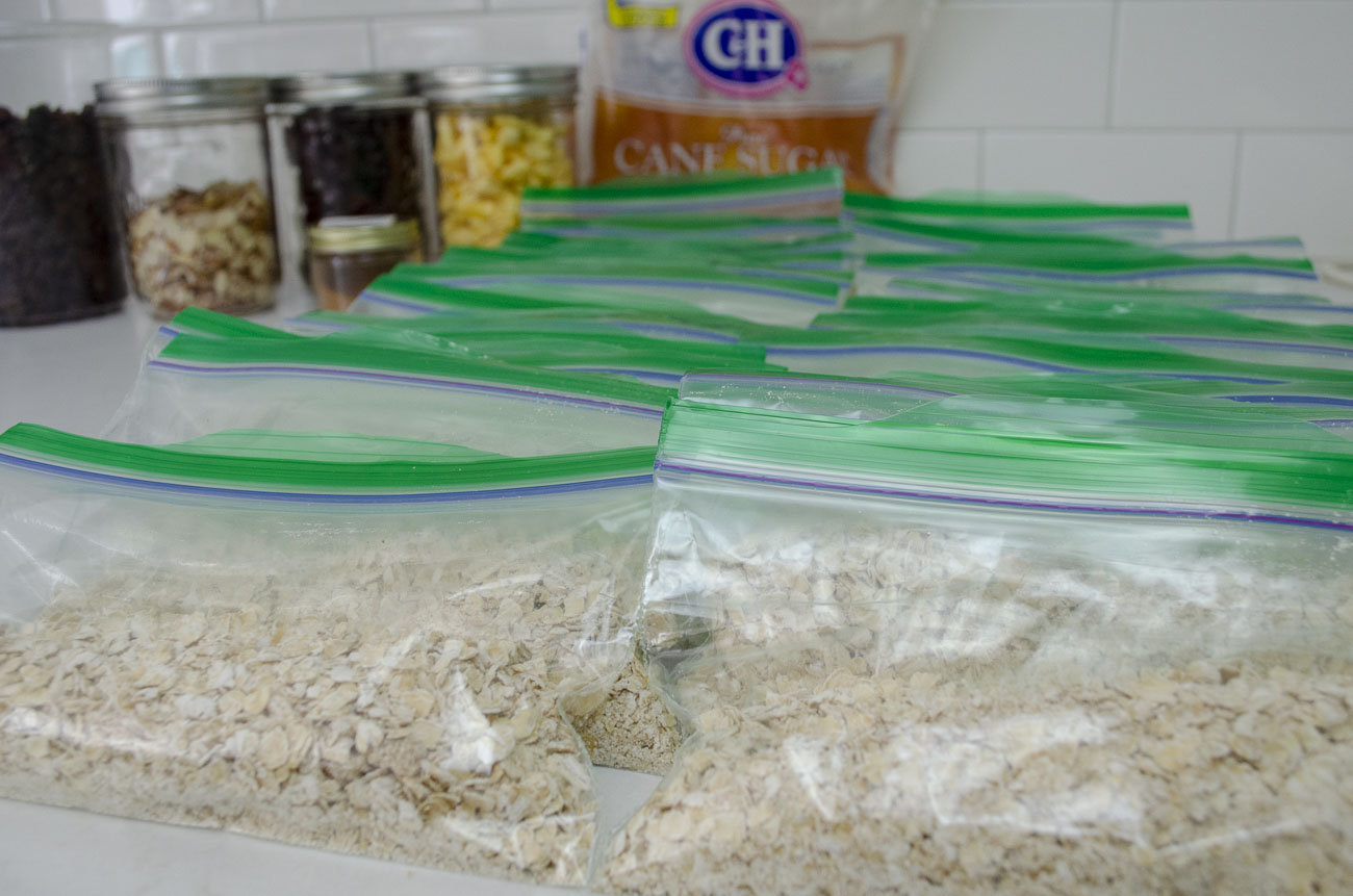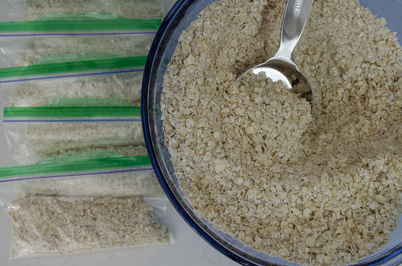 You mix together the blended oats, the regular oats, and a little bit of salt and brown sugar, and then divide the mixture out into half-cup portions. You can use mason jars or tupperware, but we like snack-sized zip-top bags.