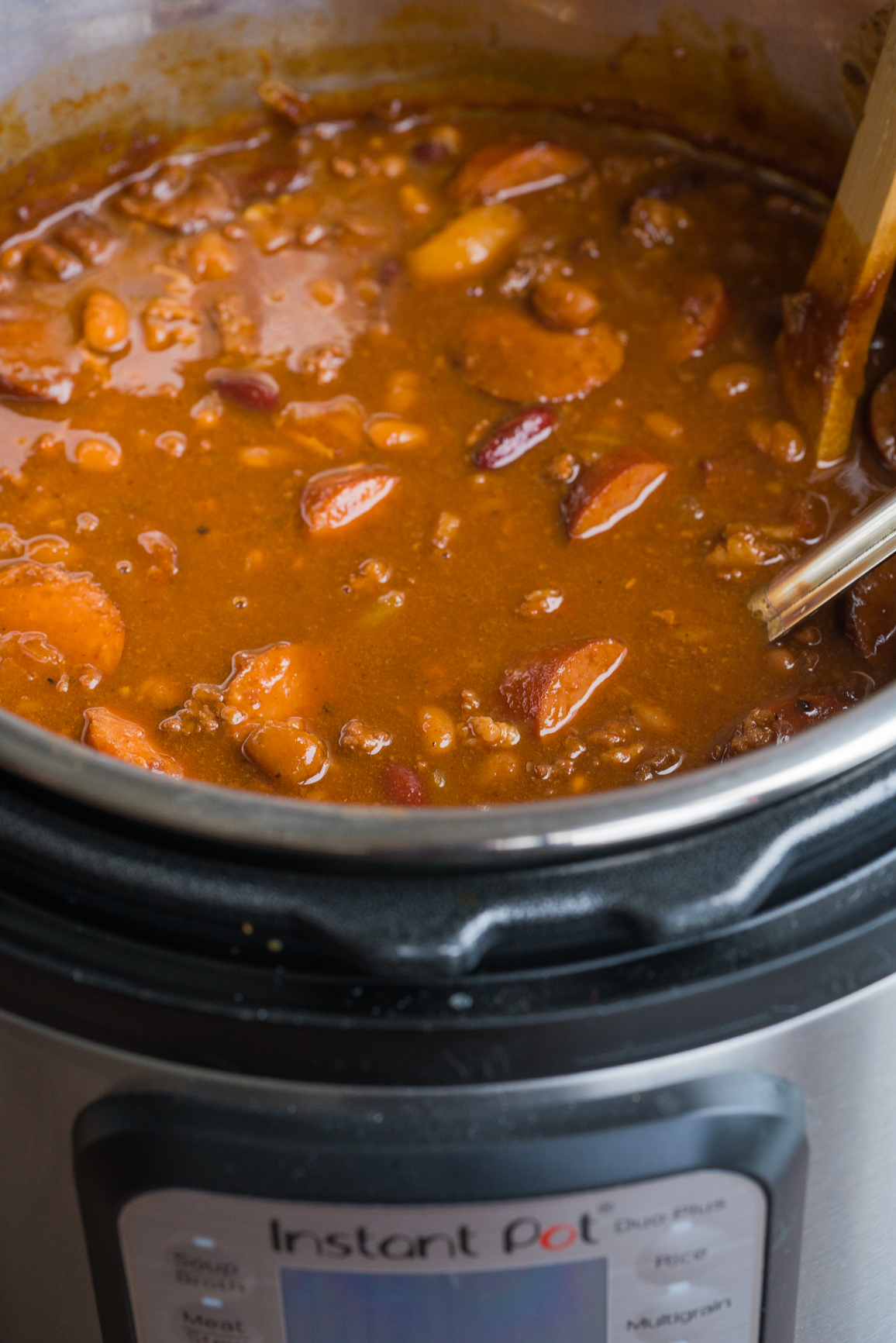 Since the Instant Pot has that nice sauté function built right in, you can make these in just one pot. You start by browning up some ground beef with onions and bacon, before adding some garlic and sliced Kielbasa. (Did I mention these were meaty? They’re very meaty.)