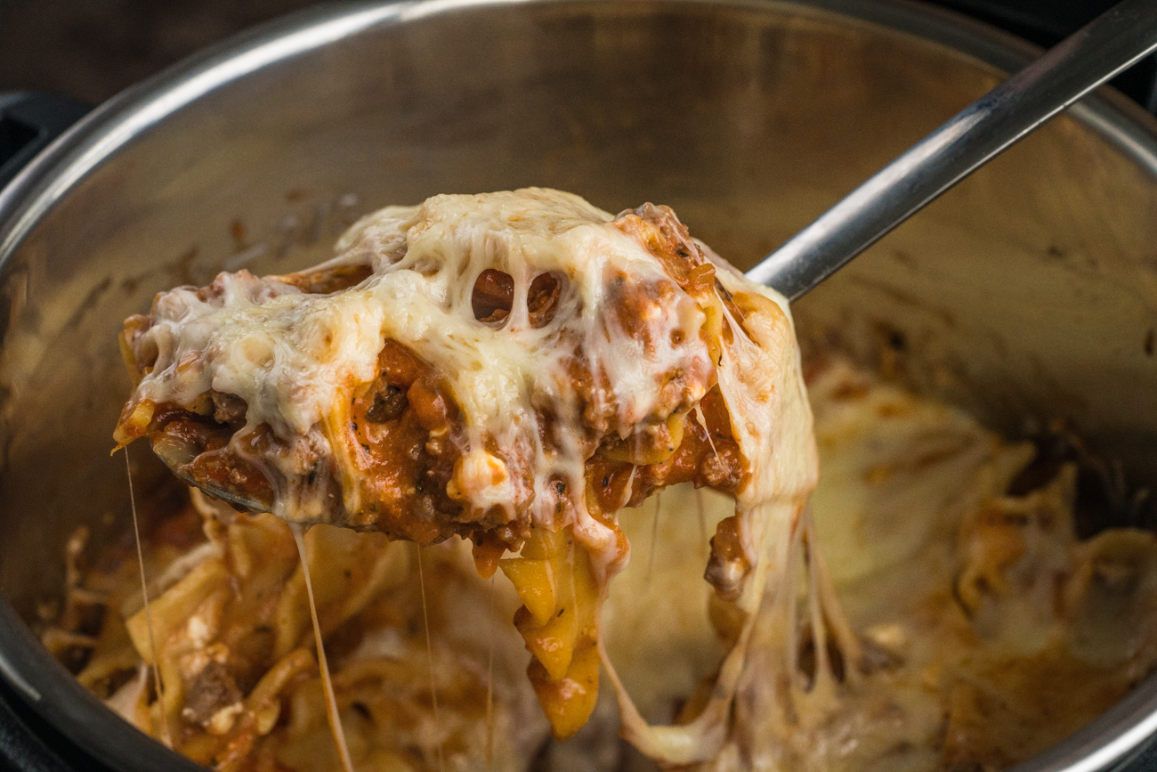 While you could do this on the stove top or in your slow cooker, this is a one pot meal that cooks in under 20 minutes. It’s kind of like if you took your favorite lasagna recipes and mixed it all together, forgoing the layers…that’s what we achieve here. It’s saucy and cheesy goodness – no crunchy, dry pasta bits here – and there’s no messing about with making a bechamel sauce or a ricotta mixture. Feel like the ultimate champion when you put this dinner on the table (…and you don’t even have to tell them how easy it was)!