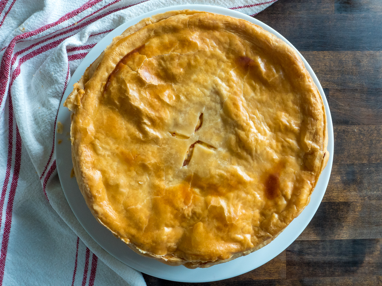 - Roll out remaining 1/3 pie dough and place on top of pie, trimming excess.