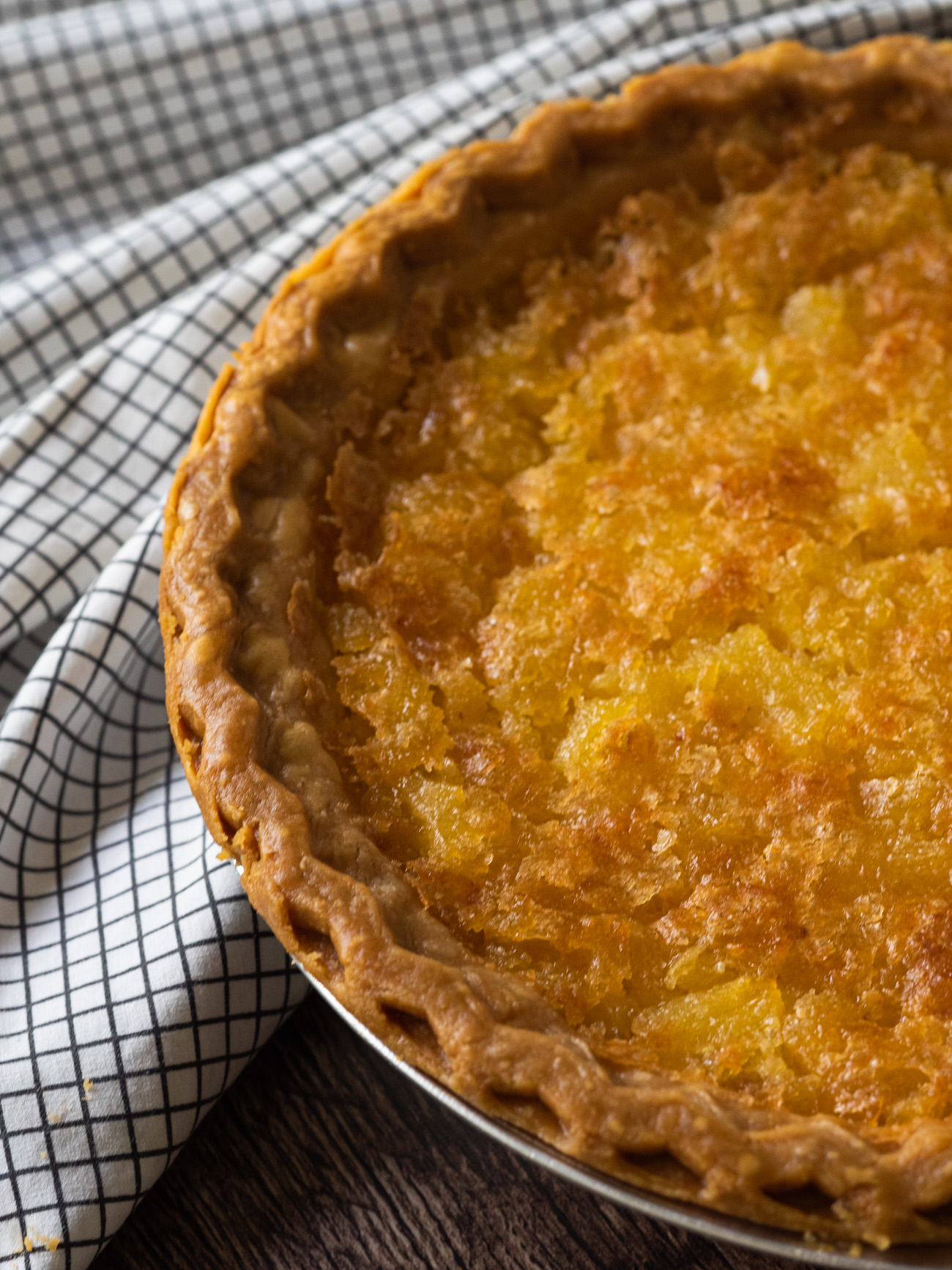 Aside from the pie crust, this pie only involves six simple ingredients. There’s pineapple and sugar, butter and eggs, flour and vanilla extract… So really it’s just some baking basics and canned pineapple. Everything is beaten together in the same bowl and poured into the pie shell, so it can’t get much simpler to make.