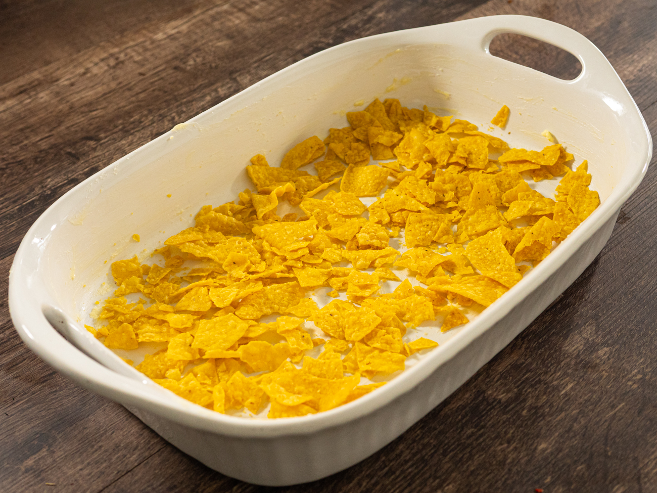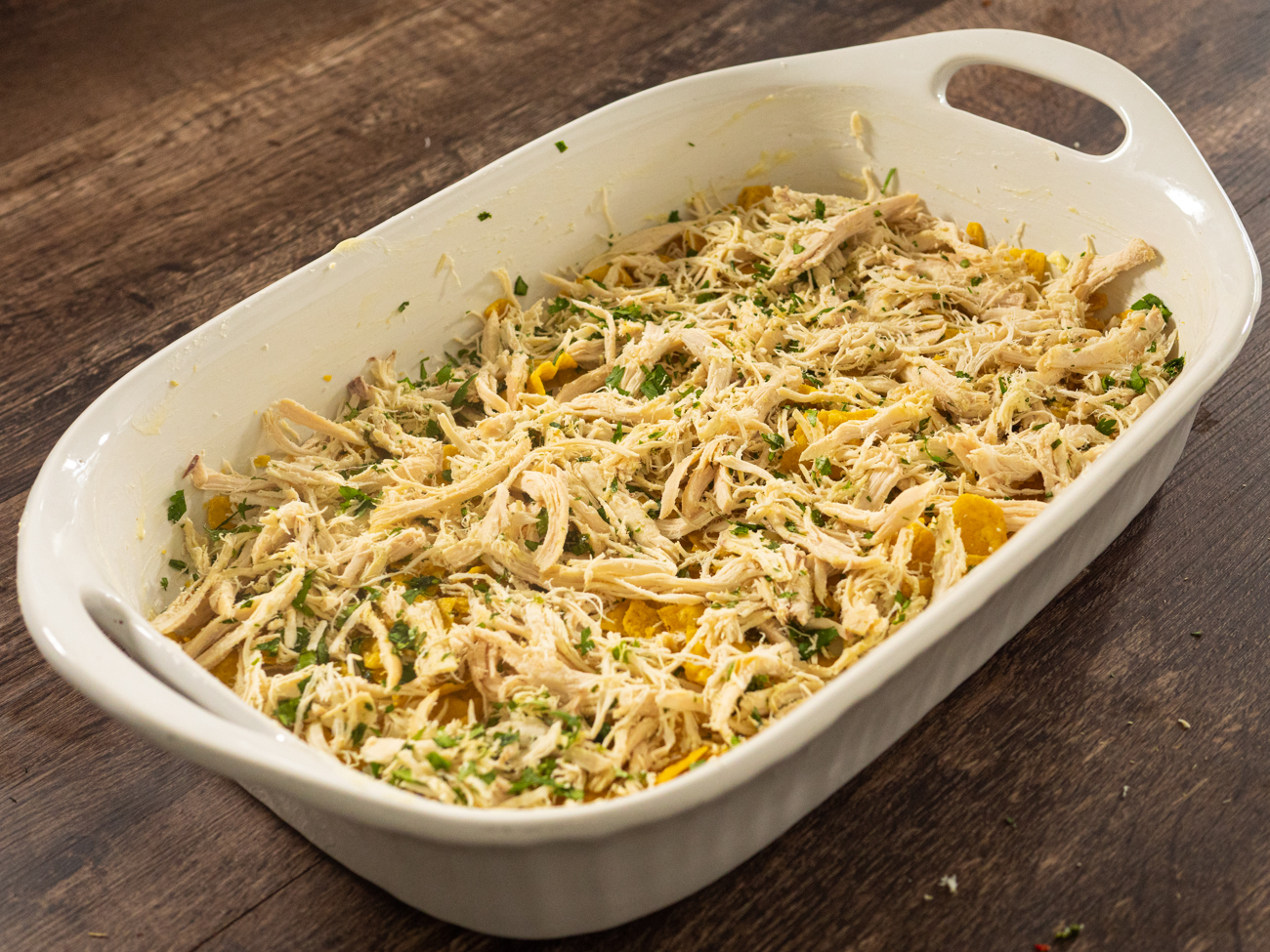 - Line prepared baking dish with 1/3 of the crushed tortilla chips, followed by 1/2 of the chicken mixture and 1/3 of the cheese. Repeat layers once more, followed by one more layer of chips and one more layer of cheese.