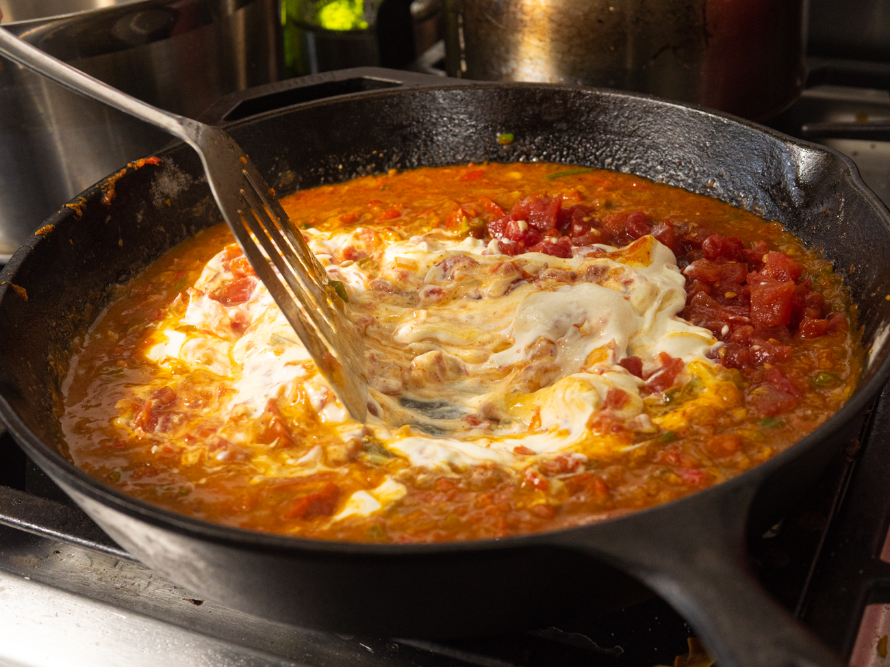 - Remove from heat and stir in drained tomatoes and chiles and sour cream. Season to taste with salt and pepper and transfer to a large bowl.