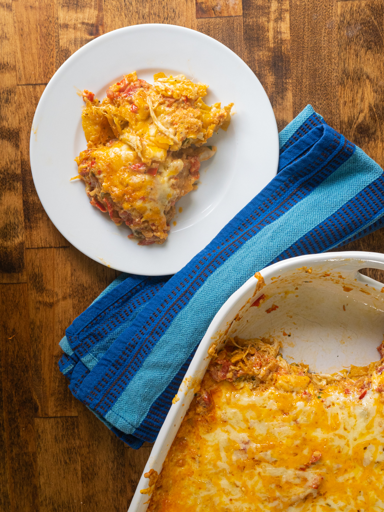 Some versions use corn tortillas to add structure, but we opt for tortilla chips that have been lightly crushed. They hold up a little bit better to baking.
