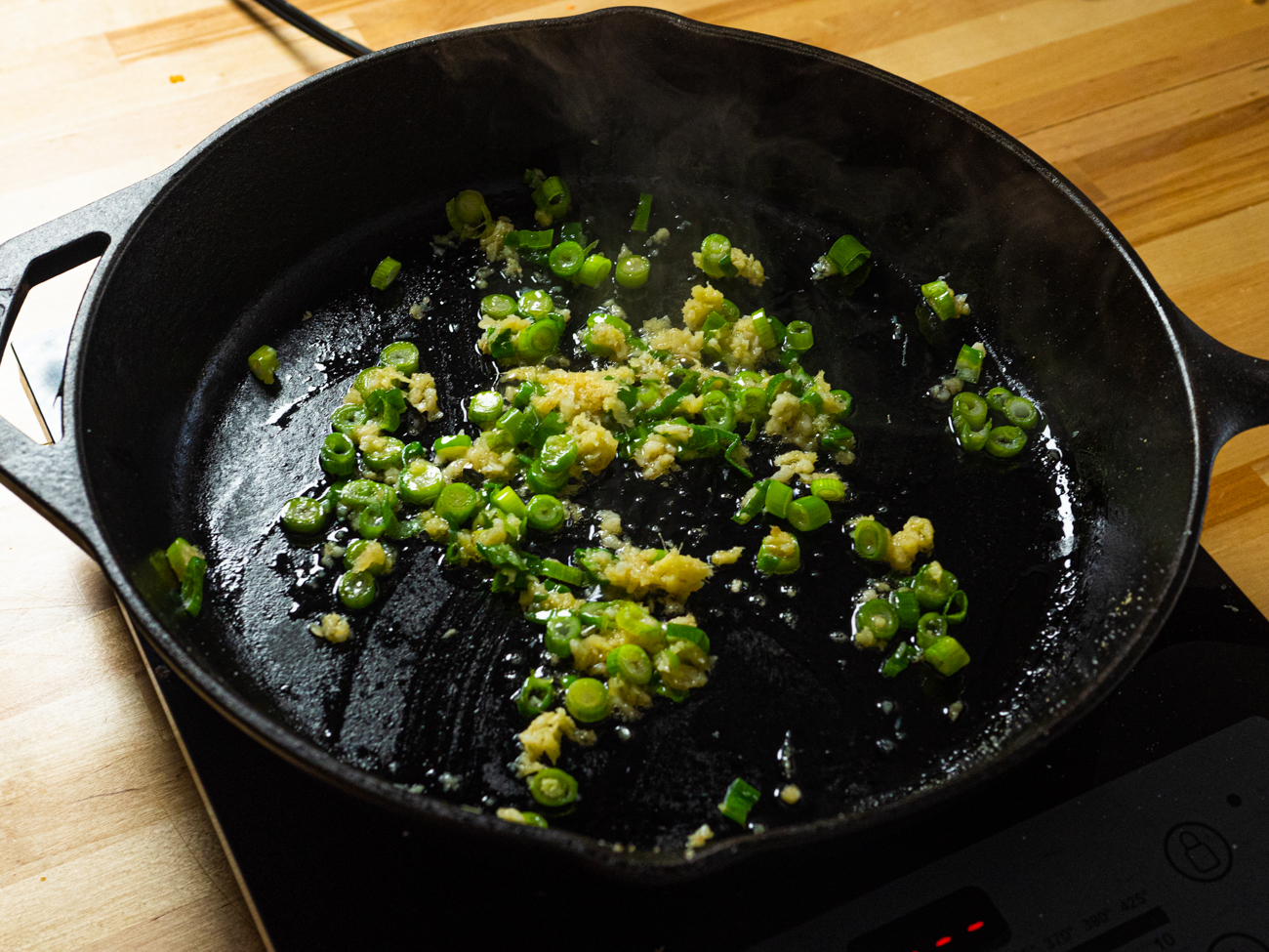 While the cauliflower bakes, you brown some garlic, ginger, and green onion…