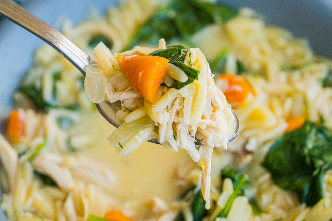 It’s an ‘avgolemono’ style of soup – a Greek technique where eggs and lemon juice are whisked together before being stirred into the broth to thicken it up a touch. What that means is you get a silky, velvety, almost creamy finish without relying on any dairy whatsoever.