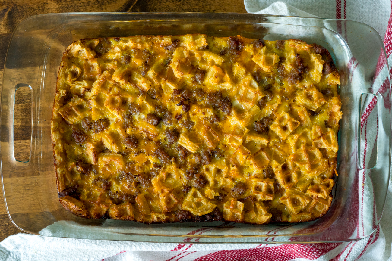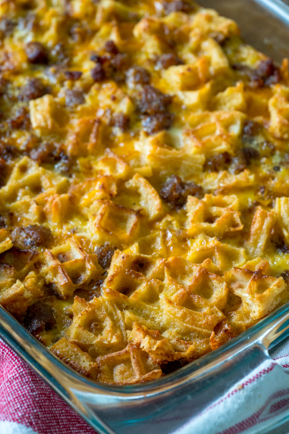 - Place chopped waffles, browned sausage and cheddar cheese in baking dish and toss together until combined.