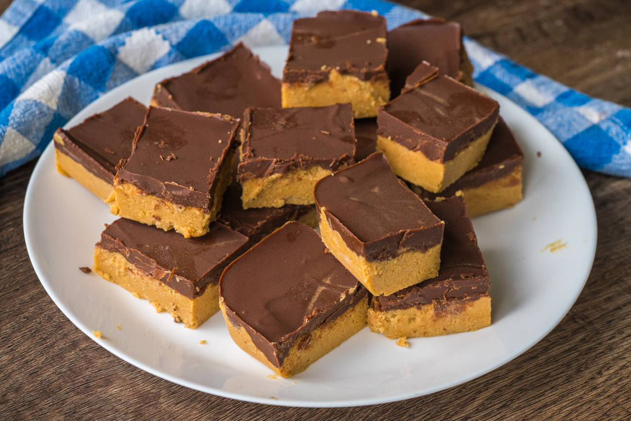 The peanut butter layer here is simple, but it’s not quite as simple as spreading some peanut butter in a pan. Instead, it involves mixing together some butter, brown sugar, and powdered sugar with the peanut butter to add a little more sweetness, some depth of flavor, and a more substantial bite. The chocolate layer is equally easy – just chocolate chips and butter melted together until smooth – and those two layers go into a pan where they chill for a bit and set up into sliceable, all-too-easily-consumable bars.