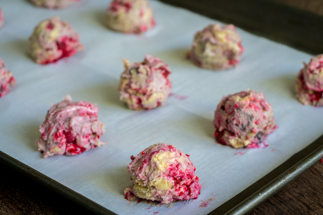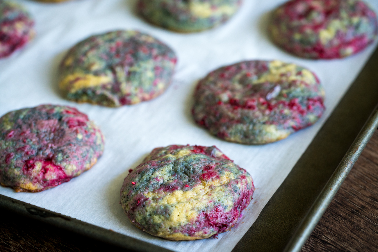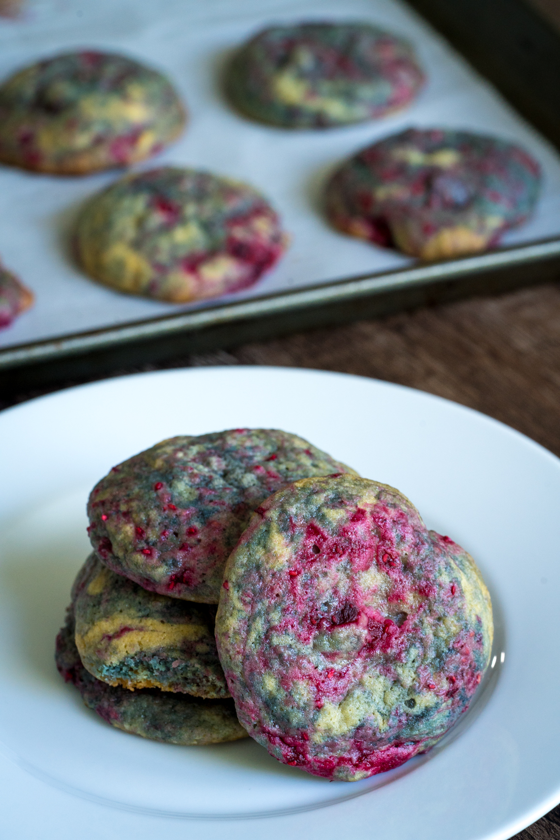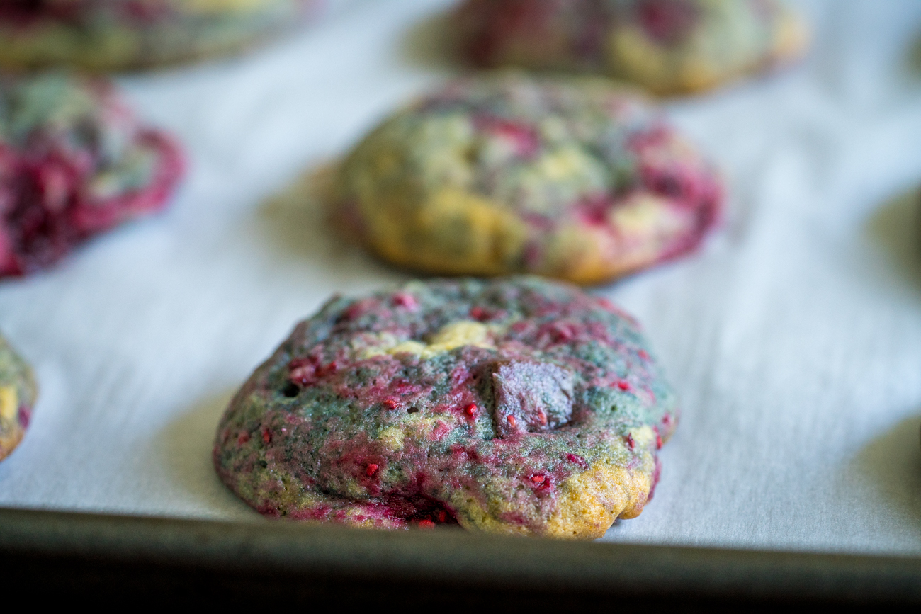 You start off with a standard chocolate chip cookie dough – except there’s more brown sugar to give it a deeper flavor and we use chocolate chunks instead of chips – but what’s unique is that we stir in frozen raspberries at the end and end up with a gorgeously marbled cookie with molten chocolate chunks and juicy berries in each bite. Yeah, we thought that sounded pretty good.