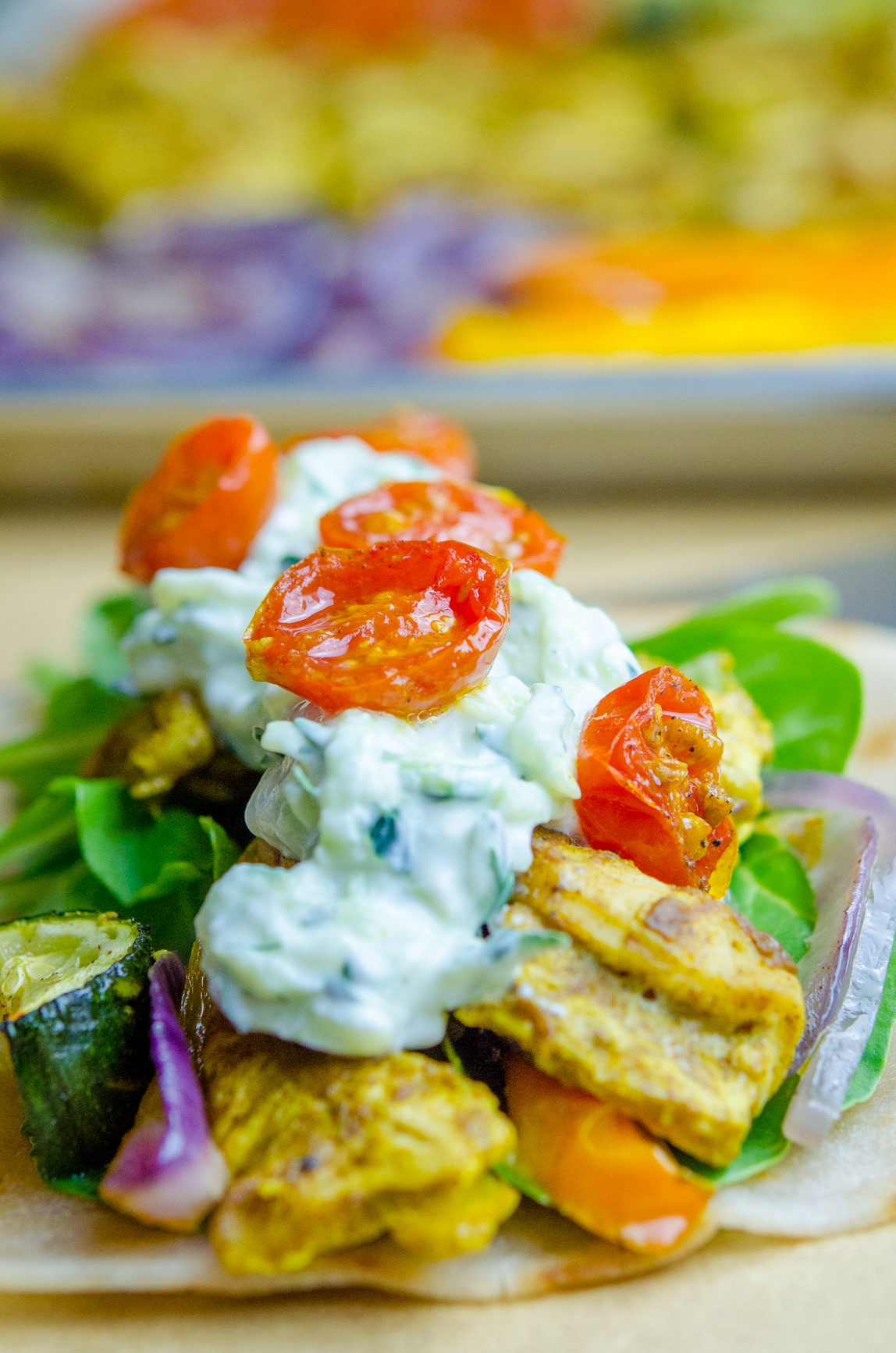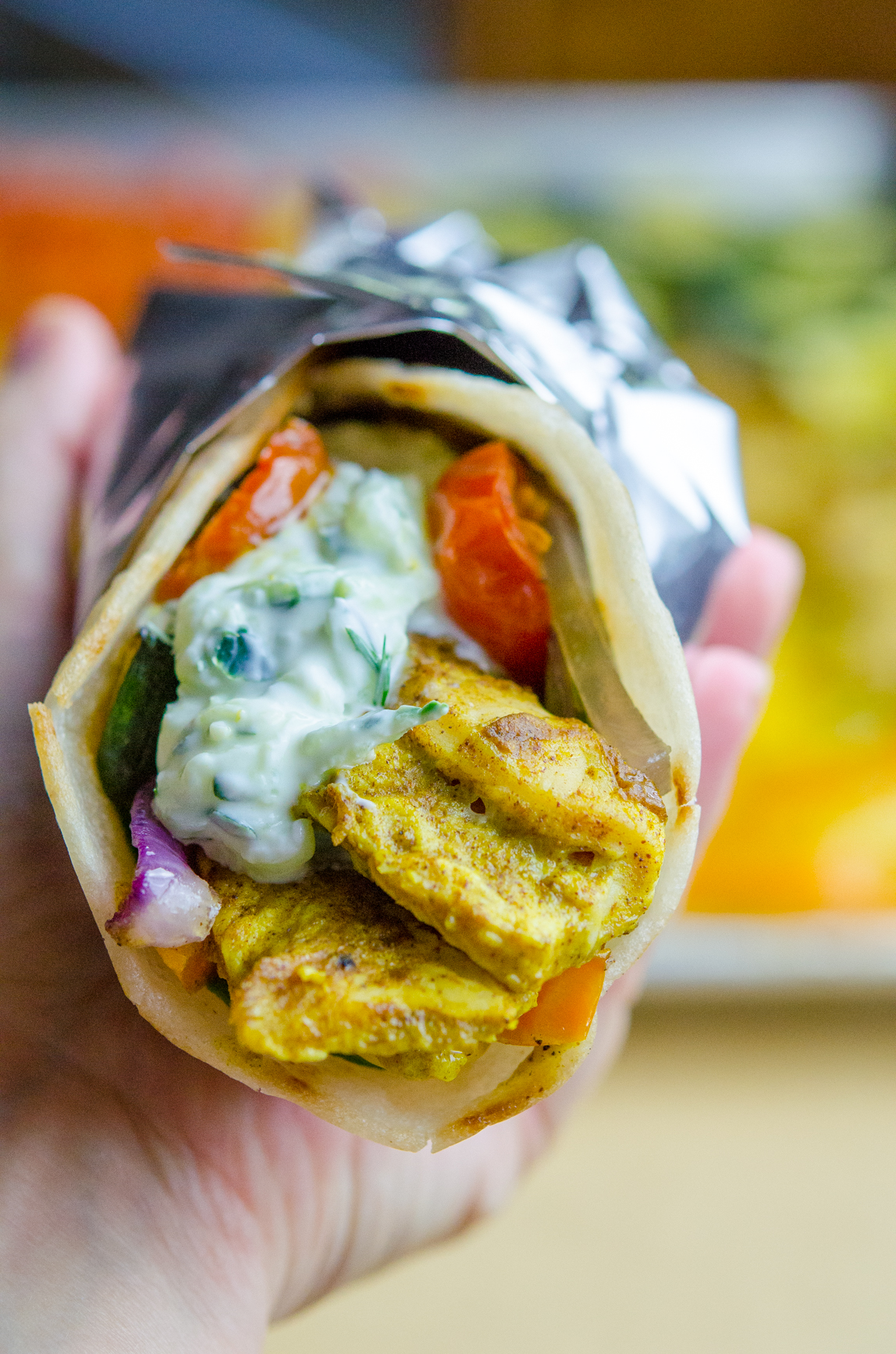 - Serve chicken and veggies in pita bread or over rice topped with tzatziki and enjoy!