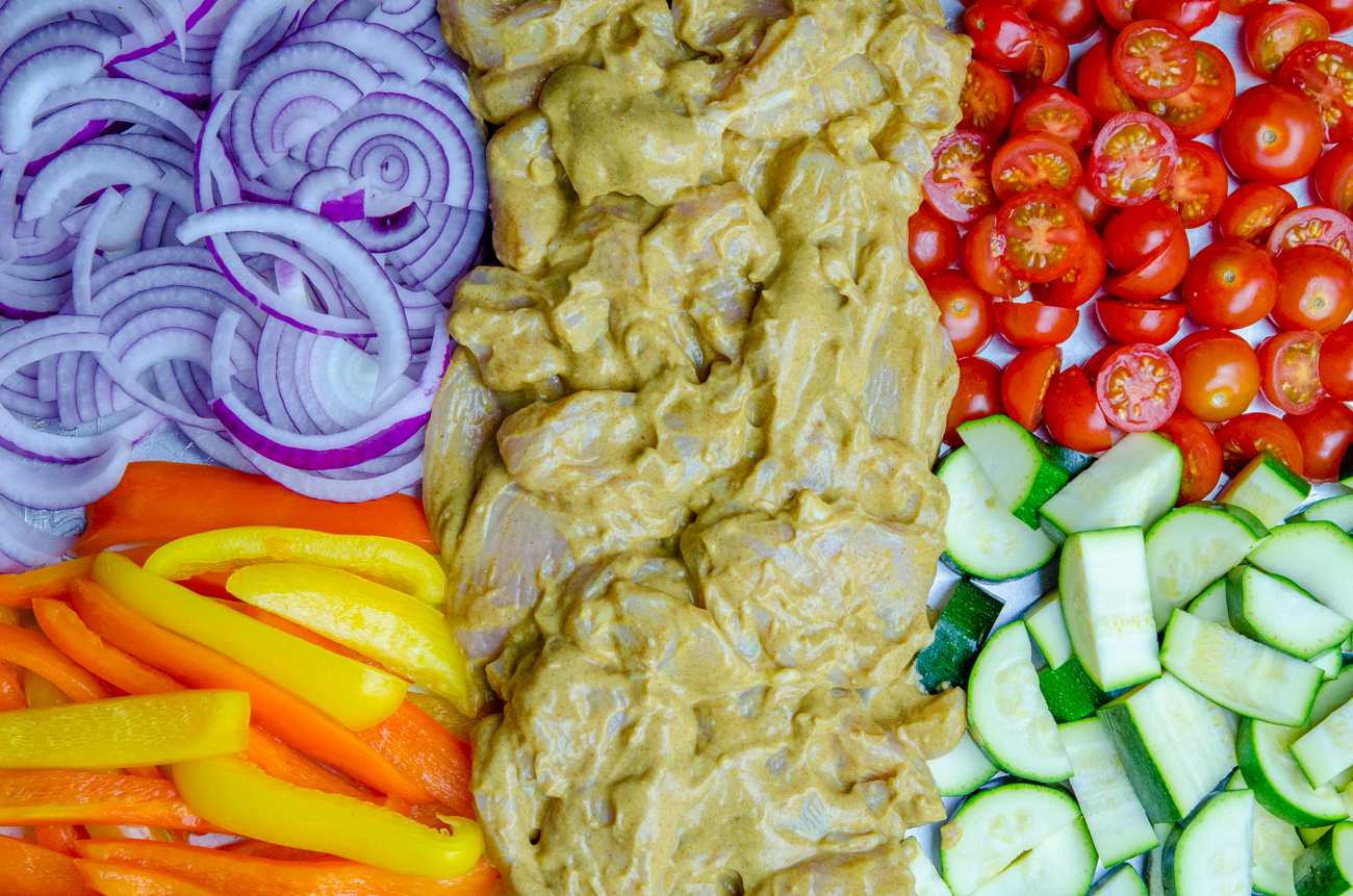 - In a large bowl, stir together 1 cup of the yogurt, cumin, cinnamon, turmeric, coriander, and salt. Add chicken in and toss until fully coated. Let sit while you chop your vegetables..