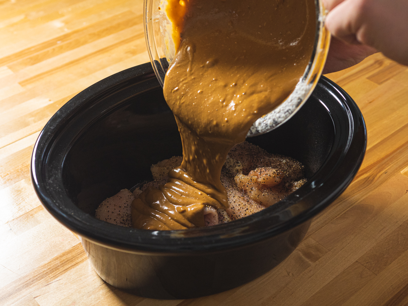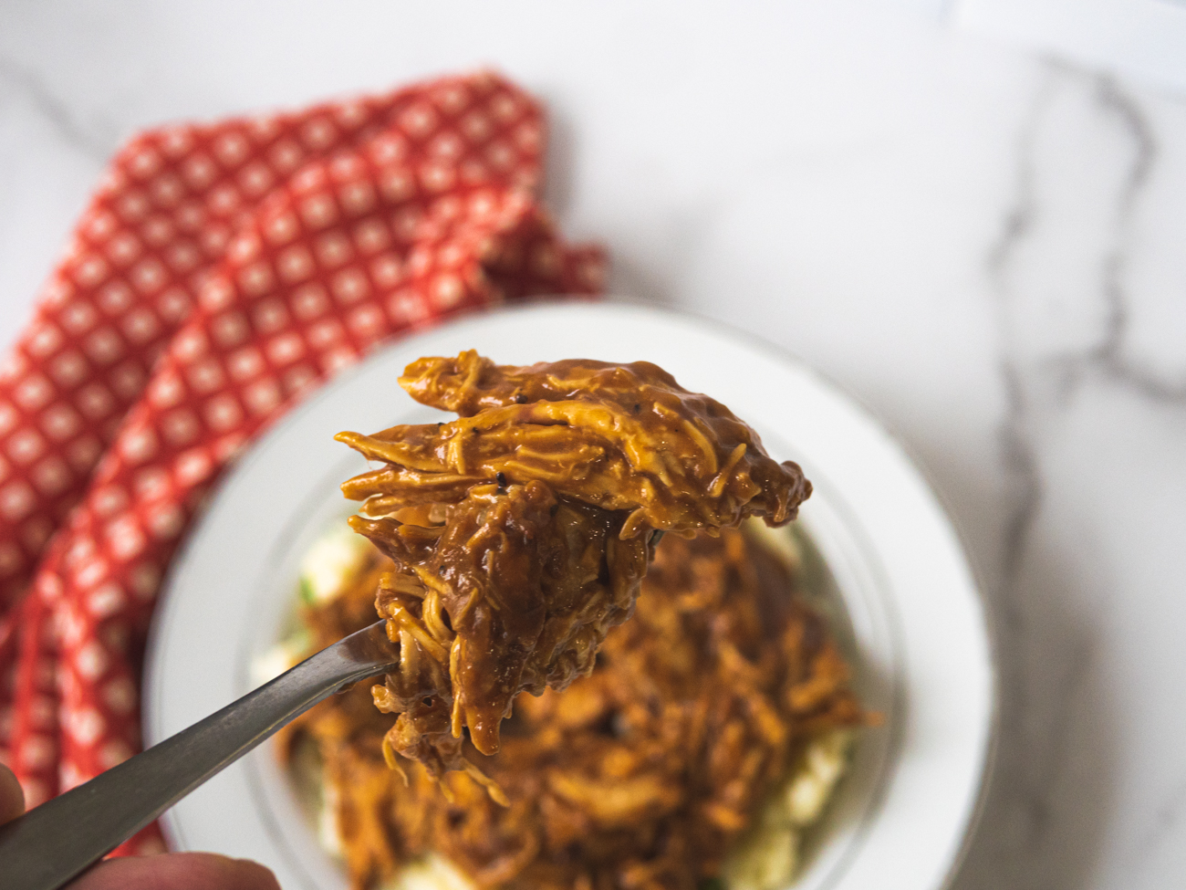 The rest is pretty simple. I just pour the sauce over the seasoned chicken and put the lid on. It takes just about three hours and when it’s done, I’ll grab two forks and shred the chicken and give it a good stir in all that luxuriously rich and creamy gravy sauce. That’s it!