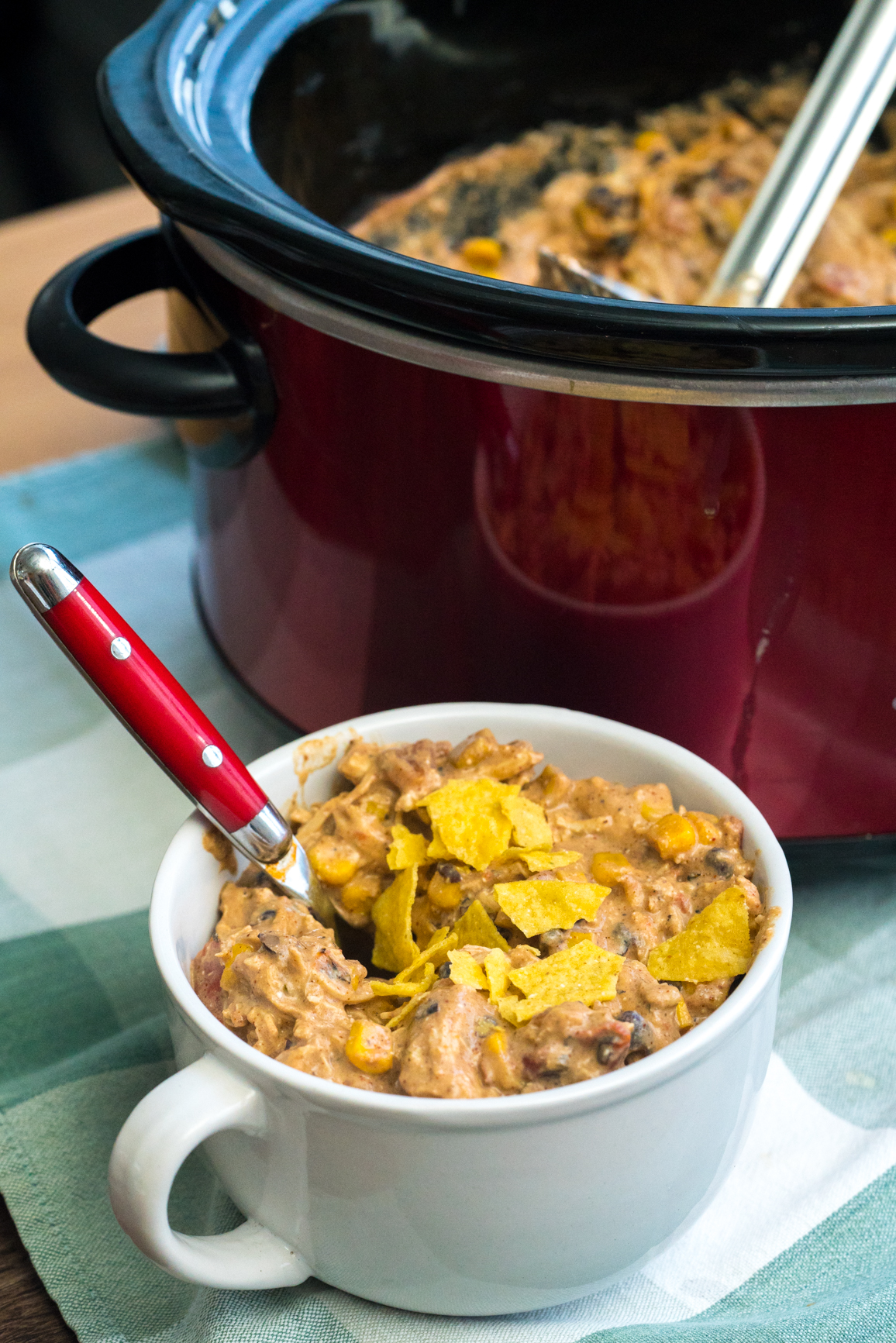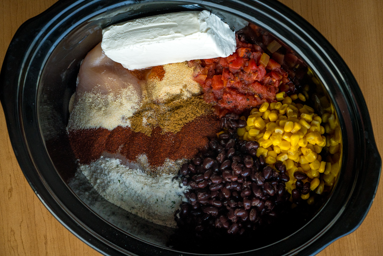 If you’re currently in the same boat that we used to be in – read: if you don’t know the joys of adding cream cheese to your chili – then grab a pen or pencil and get ready to be amazed. One of the reasons we love and turn to chili so frequently is that it’s easy, hearty and delicious. Plus, it’s almost impossible to mess up making it, which is always a bonus, but now it’s even better than before! Chicken breasts go into the slow cooker (to be shredded later), then in go the tomatoes and peppers, corn and black beans. Those ingredients make up the base of the dish and really make it filling, then it’s just a matter of seasoning…don’t skimp here, you want as much flavor as possible!