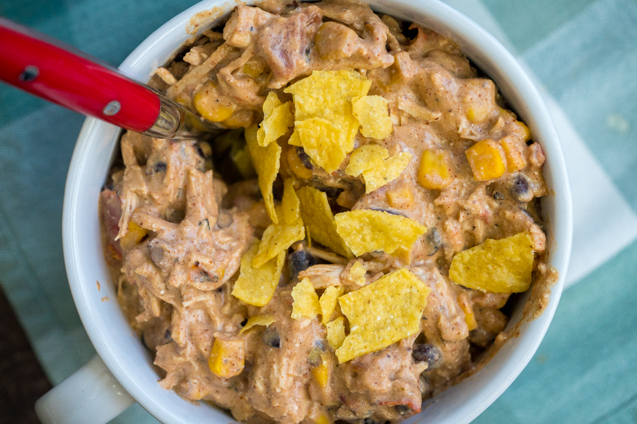 Which is why we start with dry ranch seasoning mix, then go ahead and add in chili powder, cumin, onion and garlic powders, and paprika. We’re not skimping and neither should you! You can stir everything together here to make sure all that flavor gets distributed, then on top of all of that goes your cream cheese. Everything cooks low and slow, and after a couple hours you’ll shred the chicken and stir the whole thing together into a mash of amazingness. Whatever you decide to serve this with (rice, cornbread, garlic bread, etc.) you’ve got yourself a tasty main dish that will fill you up and keep you full – you might not go back to your old way of making chili!