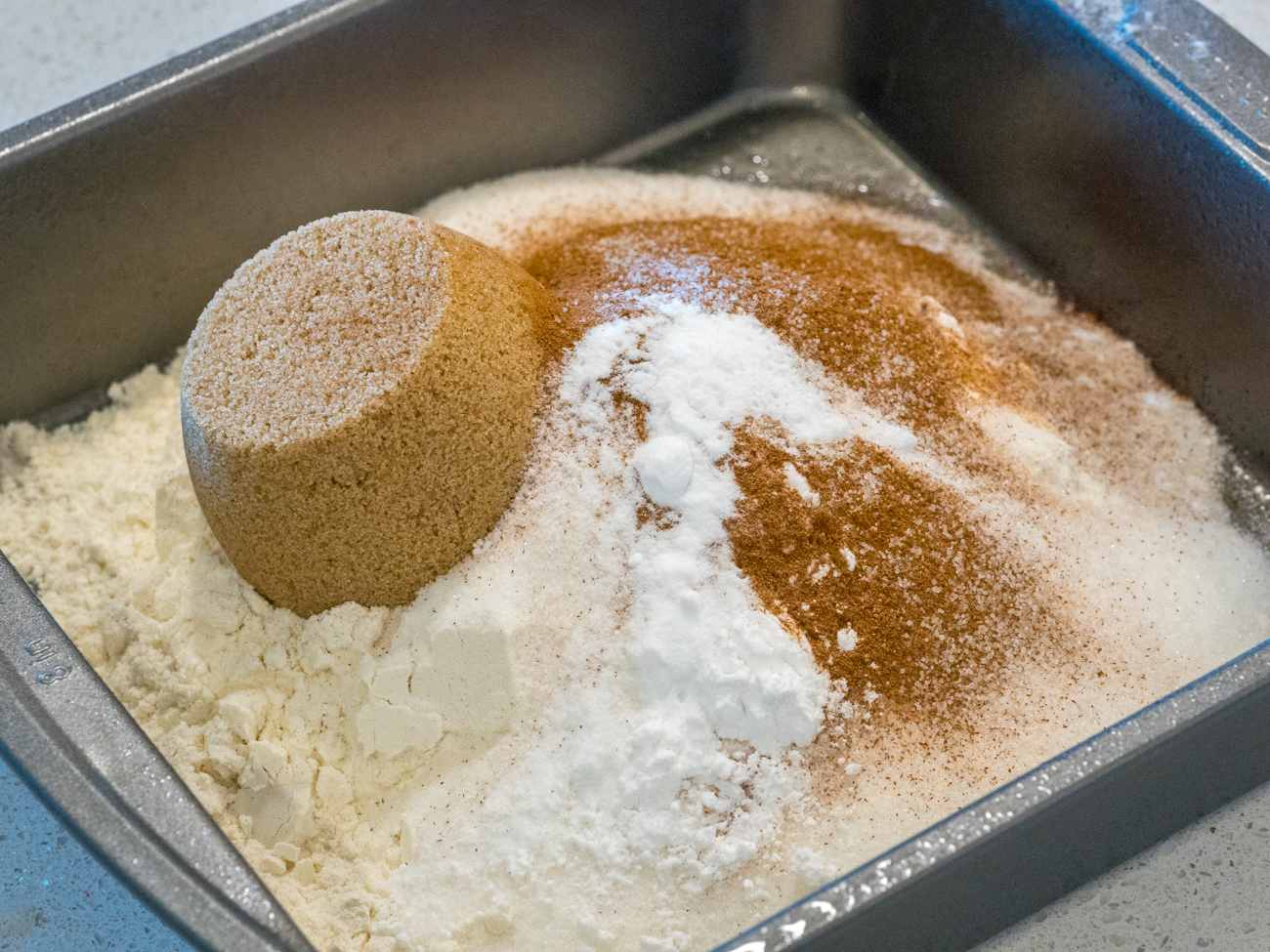 - In the baking dish, mix together the flour, sugar, brown sugar, cinnamon, baking soda, cream of tartar, and salt.