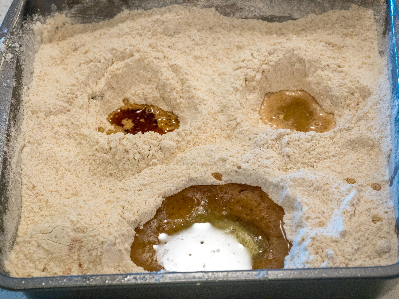 Then you make three impressions or “wells” in the dry ingredients and add your liquids – vinegar in one well, vanilla in another, vegetable oil in the third.